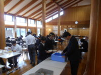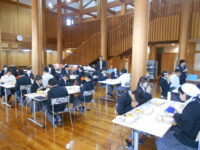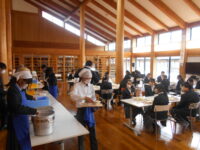 2年生は、多目的ホールで2クラス合同で給食を食べました。準備や片付けもスムーズで、楽しく食事をすることができました。子どもたちは、コロナの時期から給食は黙食が当たり前で、保育園以来、班の形で食べたことがないと言っていました。みんなで食べる経験をして、食の楽しさを知ってもらいたいです。