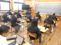 関中学校では、毎朝10分間、朝の学習、読書に取り組んでいます。静かな落ち着いた時間が流れています。2年生は、1月20日に行われるみえスタディチェックにむけて、タブレットで学習を進めています。