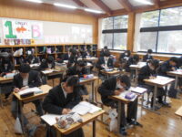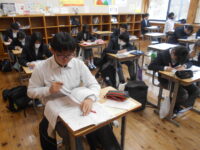 教室で全校生徒が、学習をします。教科担当の先生は各教室を回って質問に答えます。真剣に学習に取り組んでいました。