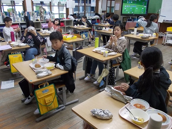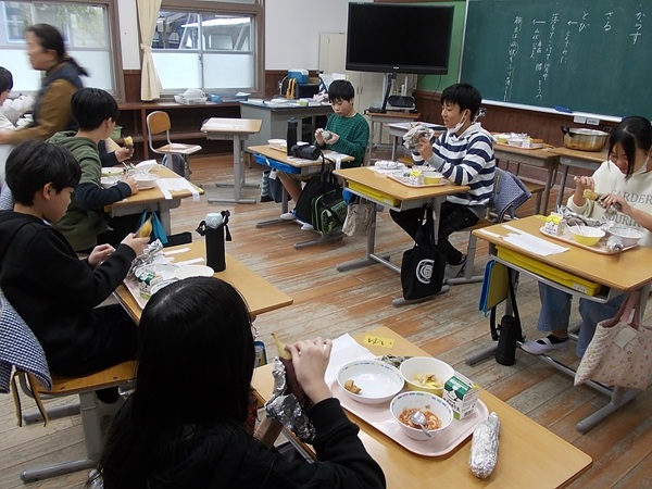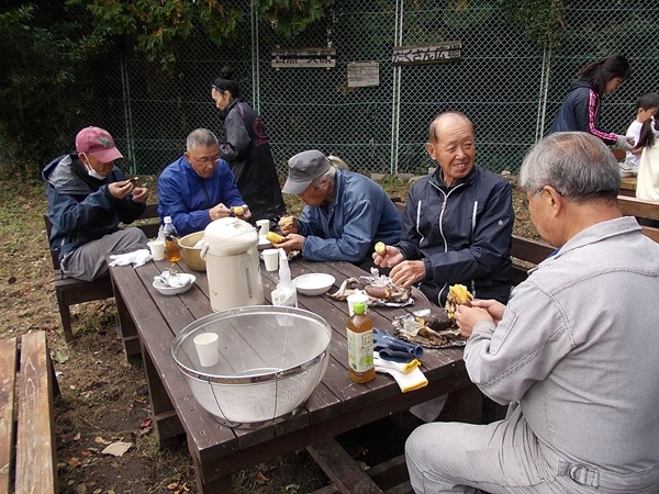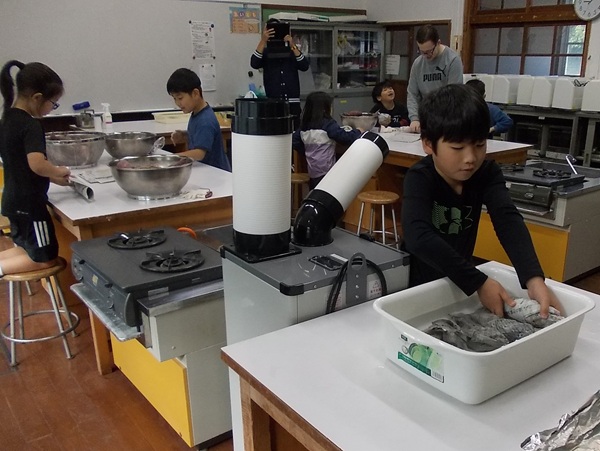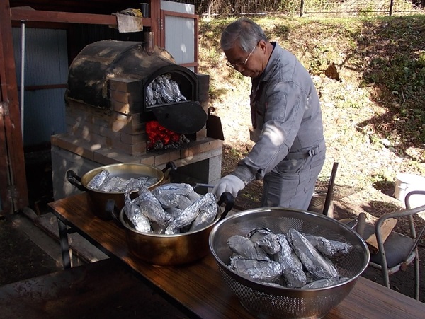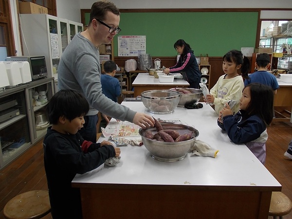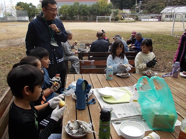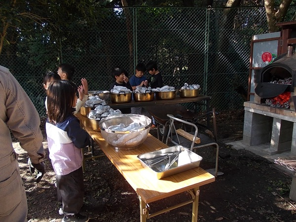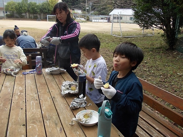 11月11日(火)、10月末の「全校いもほり」で収穫したあと音楽室前にねかせてあったサツマイモを使って焼いもをつくり、皆で味わいました。1・2年生が先週末に洗ったイモを1限目に家庭科室で新聞紙とアルミホイルで巻いて、焼いもの準備をしました。また、朝からコミュニティスクール事務員の明石さんに、運動場隅にあるピザ窯に火を入れて温めていただきました。そして、窯の余熱で1時間半ほど焼くと、おいしい焼いもが出来上がりました。まずは4限目に、サツマイモ栽培でお世話になった地域の方々と1・2年生で一足先にいただきました。子どもたちも熱々の焼いもを手に「ほくほく~」と笑顔でした。給食の時間には、3~6年生にも焼きたての焼いもを配り、給食と一緒にいただきました。「甘くておいしい!」と大好評でした。これまで、さつまいもづくりのご支援・ご協力をいただいた地域の皆さまに、あらためて感謝いたします。