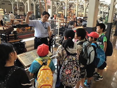 白川小では、最近は3年に一回は、全校でバスに乗って遠足に行きます。今回は名古屋のトヨタ産業技術記念館と名古屋市科学館に行きました。記念館では、実演や自動車のつくられる様子などの展示を見学しました。