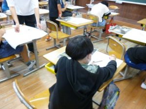 10月12日(火)5・6年生 図工 投稿日時: 2021年10月12日 投稿者: shirakawa ◎2021(令和3)年10月12日(火) 遠近法をつかって、校舎の絵をかいています。下描きをていねいに書いています。