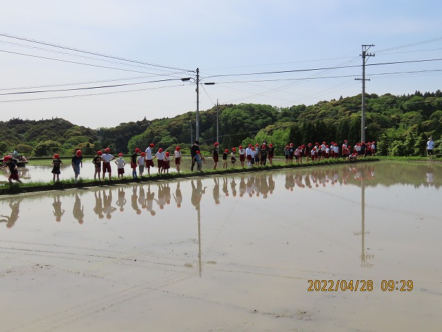昨日予定されていた全校田植えを天候や水温を配慮し、本日実施しました。朝方曇りがちの天気で気温が低いかと心配していましたが、田植えの時間ごろには、好天にめぐまれ、田植えを実施することができました。今年度も浅野正さんの田んぼをお借りし、体験をさせていただきました。田植えに至るまでの準備、これから稲刈りままでの手入れなど、いろいろなことでお世話になることに感謝の気持ちを持ちたいと思います。また、自治会長様、まちづくり協議会会長様、学校運営協議会会長様、PTA役員の方々など、たくさんの地域の方々にもお手伝いいただきました。ありがとうございました。
