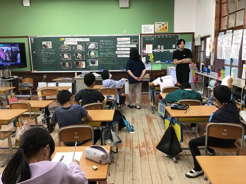 1年生と6年生で関中学校の学校栄養士の後藤先生に来校していただき、食育の授業をしていただきました。1年生では、「きゅうしょくしつのことをしろう」4年生では、「給食のごみについて考えよう」の授業をしていただきました。授業後、後藤先生は、1年生と一緒に給食を食べられました。