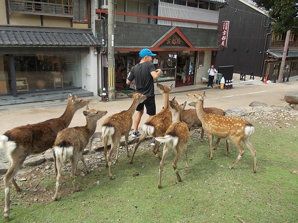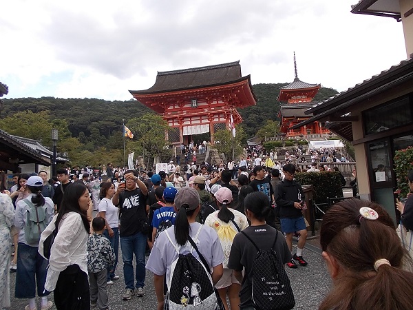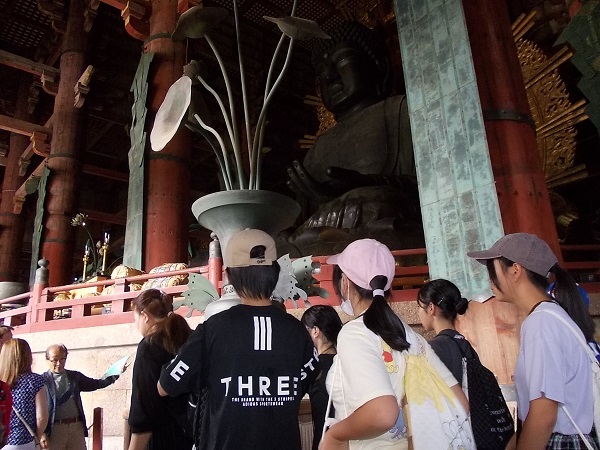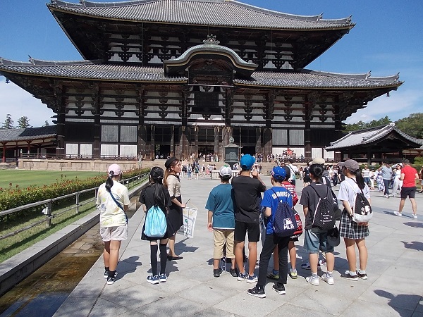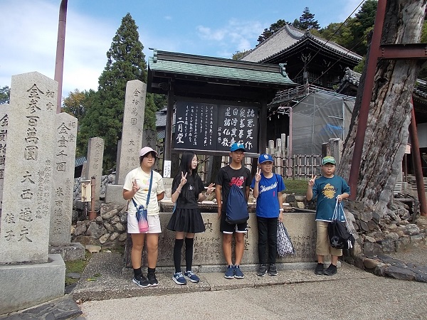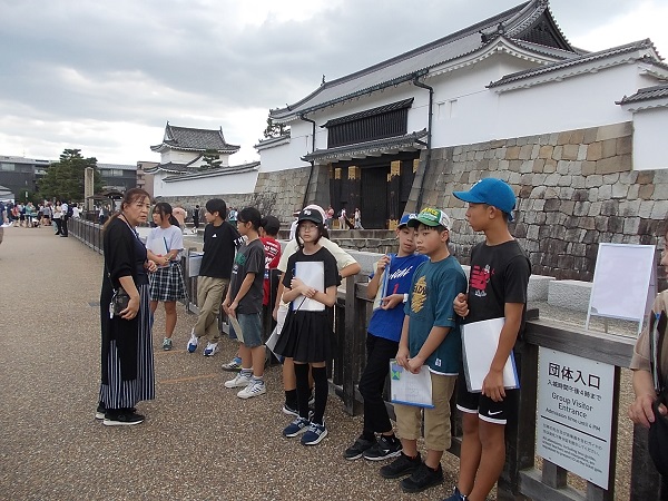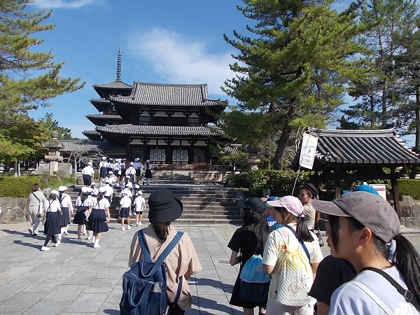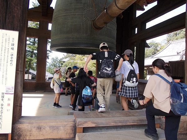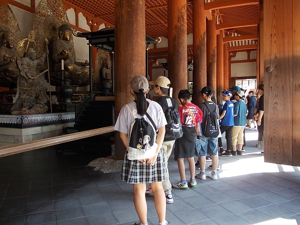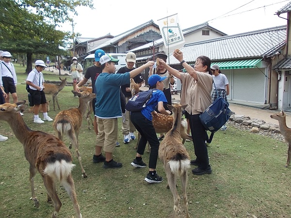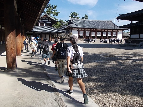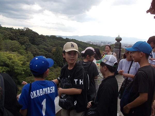 1日目は、朝7時に白川小学校を出発し、まず奈良へと向かいました。最初に法隆寺を訪れ、南大門から西院を見学しました。まだ時間が早かったためか見学者も少なく、五重塔をはじめじっくりと見学することができました。次に奈良公園に移動し、鹿と戯れたあと昼食をとり、その後歩いて二月堂から東大寺を見学しました。階段や至る所に落ちている鹿の糞に足元に注意しながらの移動でしたが、秋晴れのさわやかな天気でとても気持ちよかったです。東大寺を見学したあと、少し時間をとって外国からの観光客に話しかける「イングリッシュチャレンジ」を行い、子どもたちは勇気を出して話しかけていました。次に京都へ移動し、始めに二条城を見学しました。キュッキュッと鳴る「うぐいす張り」の廊下は、子どもたちにとっても初めての経験でした。最後に見学した清水寺は、すごい観光客の数で、人波にのまれてはぐれないよう移動も一苦労でした。清水坂で買い物をして、宿泊地である宇多野ユースホステルに入りました。