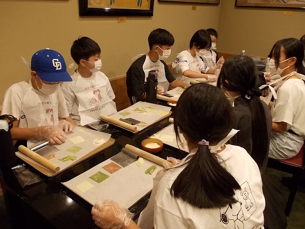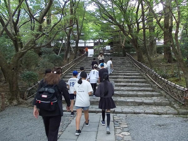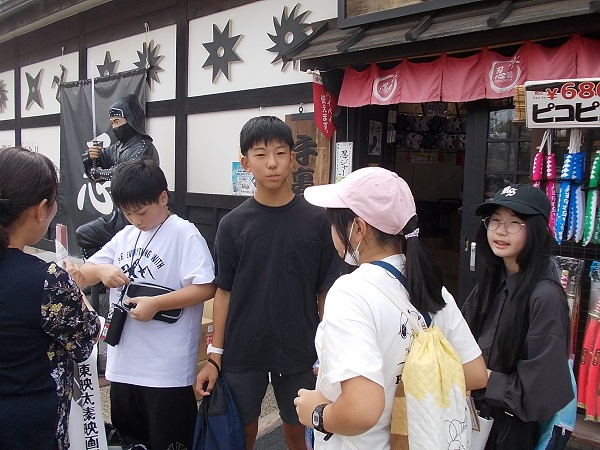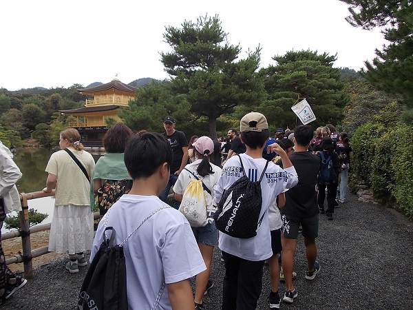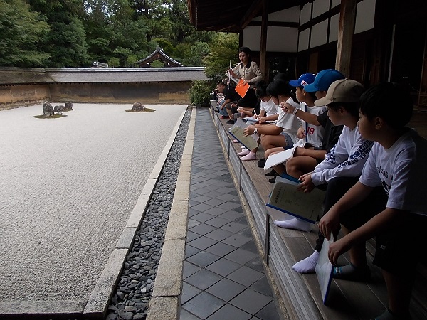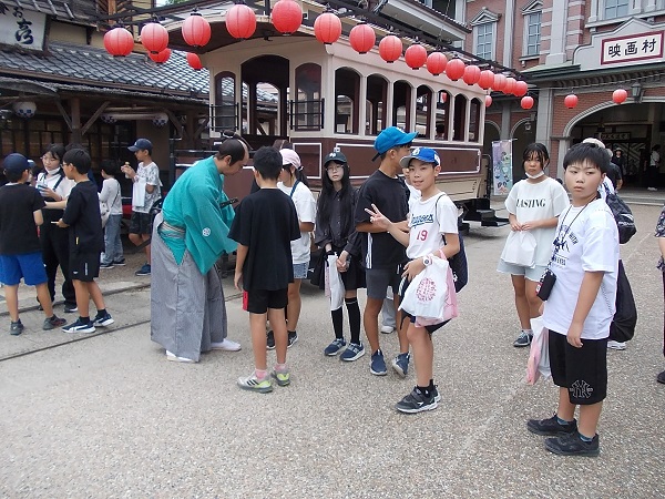 2日目は、まず石庭で有名な龍安寺を訪れ、寺内の静けさに心を落ち着かせました。次に「八つ橋庵とししゅう館」に移動し、生八つ橋手づくり体験を行いました。子どもたちは自分で生地を伸ばしてつくった生八つ橋を、「家族へのおみやげにする」と大事に包んでいました。次に鹿苑寺を訪れ、金色に輝く「金閣」を中心に見学しました。観光客にも人気のスポットとあって、清水寺と同じぐらいの人波でしたが、9人という少人数を生かして手際よく見学することができました。その後、立命館大学平和ミュージアムを訪れて、「平和」についての学習を行いました。子どもたちは展示を真剣に見学しながら、自分にとっての「平和」とは何かを考えていました。最後に訪れた東映太秦映画村では、修学旅行の最後のお楽しみとばかりに、子どもたちは時代劇のセットを見学したりアトラクションを楽しんだりお土産を買ったりと目いっぱい楽しんでいました。帰りのバスの中では、二日間の疲れが出たのか、子どもたちもとても静かでした。楽しい思い出をたくさんつくることができた修学旅行でしたね。