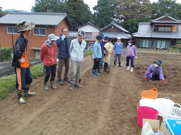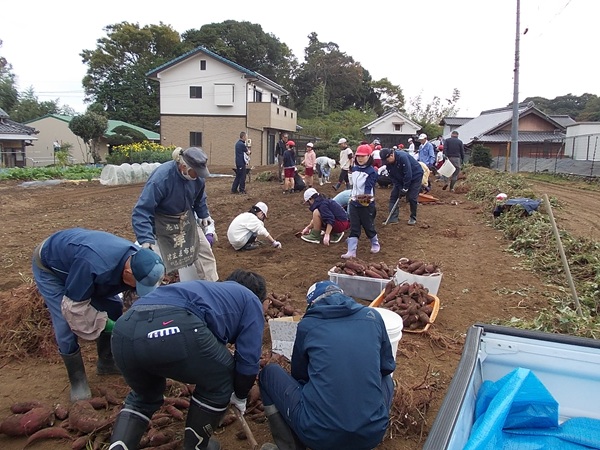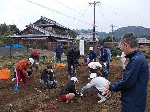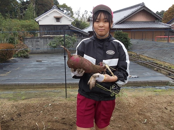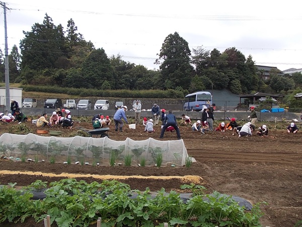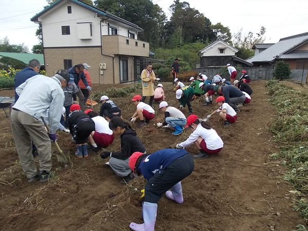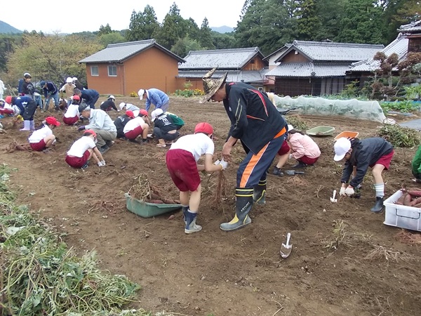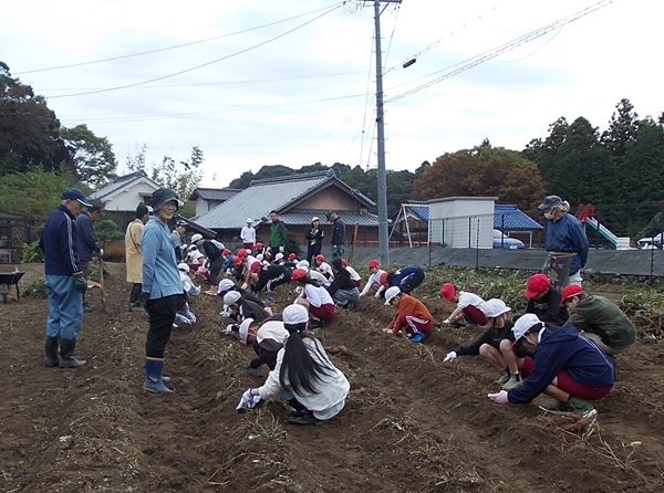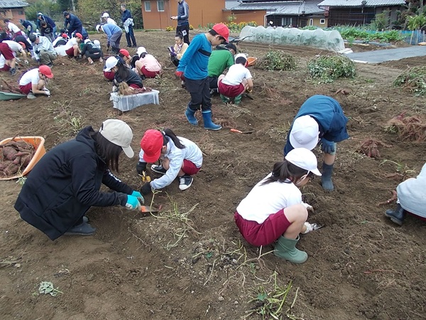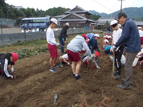 10月31日(金)1・2時間目、6月6日に1・2年生が「いもさし」を行った佐野重雄さんの畑を訪れて、全校児童による「いもほり」を行いました。事前に地域の皆さまが、畑を覆っていたイモのつるや葉を取り除き、子どもたちがいもほりをし易い状態にしていただいたので、とても助かりました。移植ごてを手にした子どもたちは、「始め!」の声で一斉にイモを掘り始め、「でた~」「大きい!」などと口々に騒ぎながら、楽しそうにいもほりに取り組んでいました。今年のイモは、昨年に比べるとやや小ぶりなものが多いようでしたが、焼き芋にするにはちょうど良いサイズのものがたくさん収穫できました。しばらく音楽室前でねかせてから、家庭にお配りしたり焼き芋にしたり給食の食材として活用するなどしていきます。これまで畑の世話をしていただきました佐野さまをはじめ、お忙しい中いもほりの準備・補助をしていただきました地域の皆さま・JA鈴鹿関係者の皆さま、ありがとうございました。