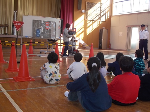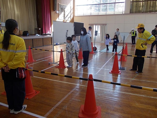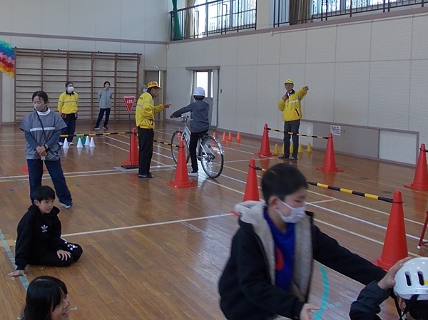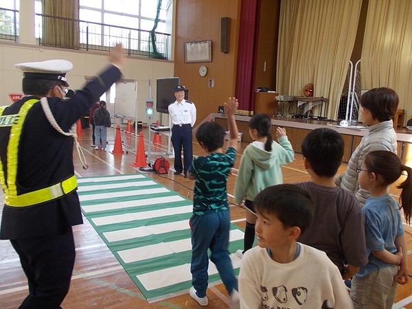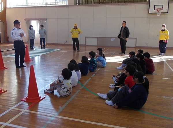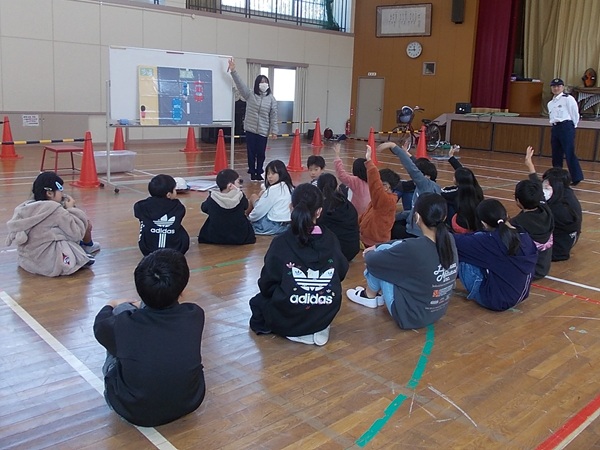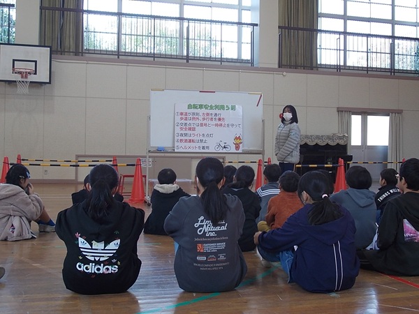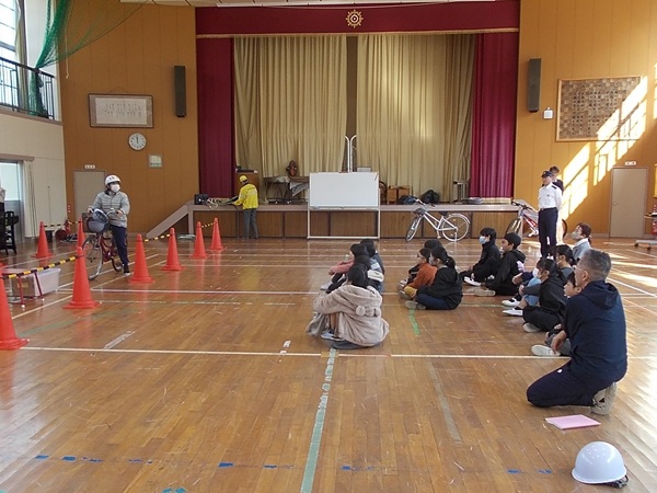 11月27日(木)3・4限目、亀山警察署と県・市の交通安全協会より講師の方々を招いて、体育館で交通安全教室を開催しました。3限目に行われた低学年(1~3年生)の部では、「交通ルールとは?」「横断歩道の渡り方」「道路の歩き方」などについて教えていただき、体育館につくった道路を実際に渡ったり歩いたりしてみました。歩道や路側帯のない道路では右側を一列で歩くこと、横断歩道では一歩下がって待つこと、青になってもすぐに渡らずに左右の安全確認をしてから手を挙げて渡ること、見通しの悪い場所では車が来ているかもしれないと考えて確認することなどを教えていただきました。また、4限目に行われた高学年(4~6年)の部では、「自転車で走る場所」「自転車安全利用5則」「自転車の安全な乗り方」などについて教えていただきました。白川小学校の子どもたちの多くは、卒業したら亀山中学校へ自転車で通学することになります。安全な自転車の乗り方を身につけておくことはとても大切なことですね。校区には、県道11号線を除いては大きな道路は少ないですが、狭くて見通しの悪い道路が多いので、「道路に広がらないこと」「見通しの悪い場所では安全確認をしっかりとし、絶対に飛び出さないこと」を特に気を付けましょう!