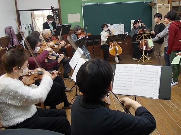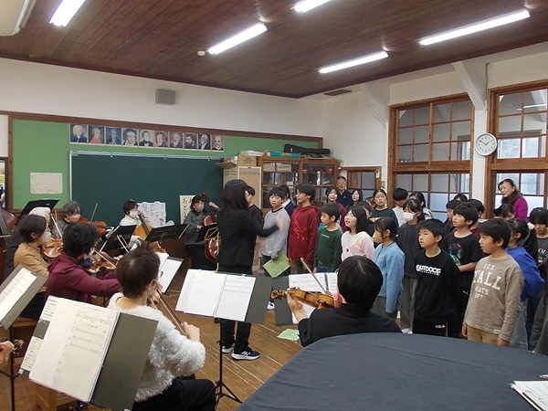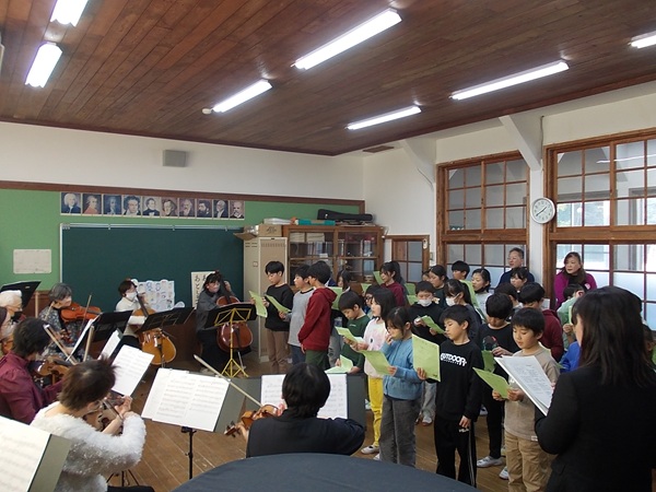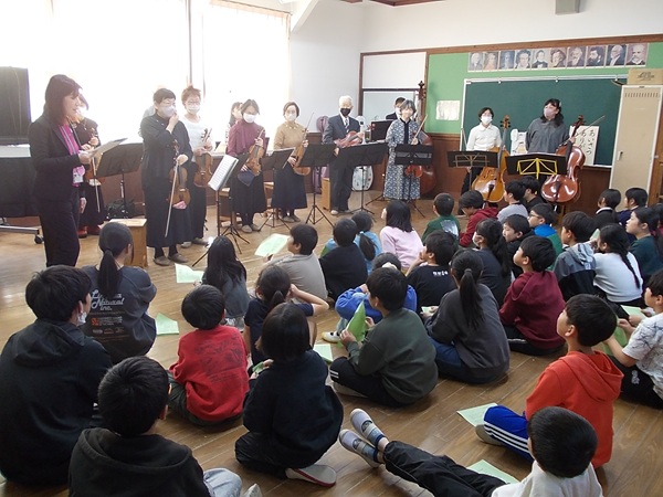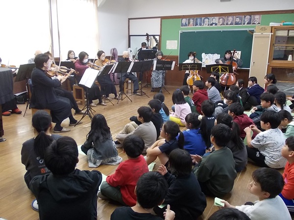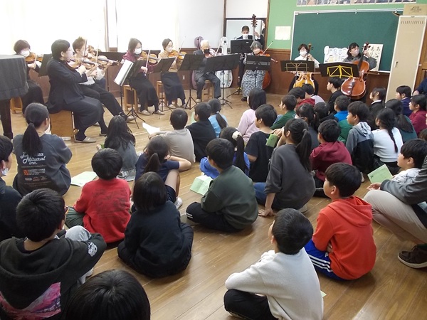 12月10日(水)5限目、「アンサンブル縁S」さまをお招きして、「生の弦楽合奏の演奏に触れて感動を味わうとともに、音楽の面白さや良さ・美しさを感じ取ることによって、音楽に対する感性を育てる」ことをねらいとし、全校での音楽鑑賞会を行いました。始めに、音楽の授業で聴いたことのある「アイネ・クライネ・ナハトムジーク」、音の重なりが美しい「小フーガト短調」や子どもたちもよく知っている「クシコスポスト」を演奏していただきました。12名の奏者による演奏を音楽室という狭い空間で聴くことで、生の弦楽器の迫力ある演奏を楽しむことができました。続いて「さんぽ」と「大きな古時計」の二曲を、合奏に合わせてみんなで歌いました。とってもぜいたくな合唱でしたね? さらにクリスマスにちなんだ曲をメドレーで演奏していただきました。最後はなんと校歌を演奏していただいて、皆で校歌を合唱して音楽鑑賞会を終えました。今回来校していただいた12名のメンバーの中には、退職された先生も含まれていて、定期的に集まって練習を重ねているそうです。素敵な演奏を披露していただいた「アンサンブル縁S」の皆さまに感謝いたします。ありがとうございました。