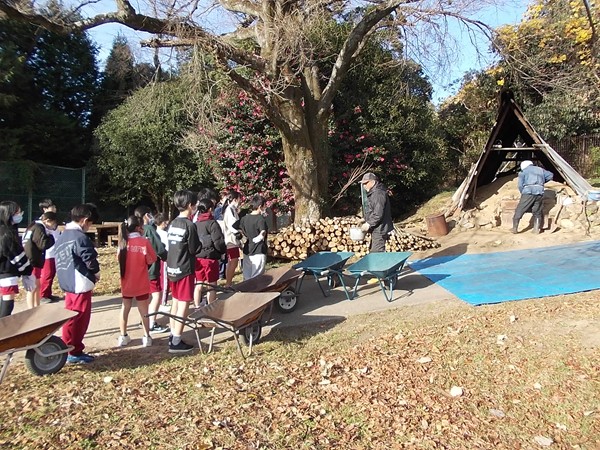 12月10日(水)1限目、11月27日から行った2回目の炭焼きの「炭」を炭窯から取り出す「窯出し」を、5・6年生が手伝いました。炭焼き講師の浅野さんと川合さんが炭窯の入口の鉄板と焚き付けにくべた材木をどけて、窯の中から次々に取り出していただいた炭を、子どもたちは一輪車に乗せて体育倉庫まで運び、慣れた手つきでていねいに仕分けしていきました。今回の炭焼きでは、1回目よりも上質な炭がきれいに焼きあがっており、炭と炭を打ち合わせると澄んだ音色が響きました。空になった窯には新たに原木がいれられ、本日から3回目の炭焼きが始まっています。
