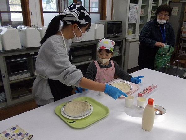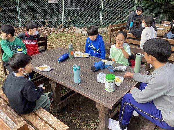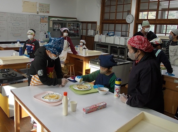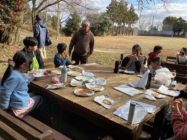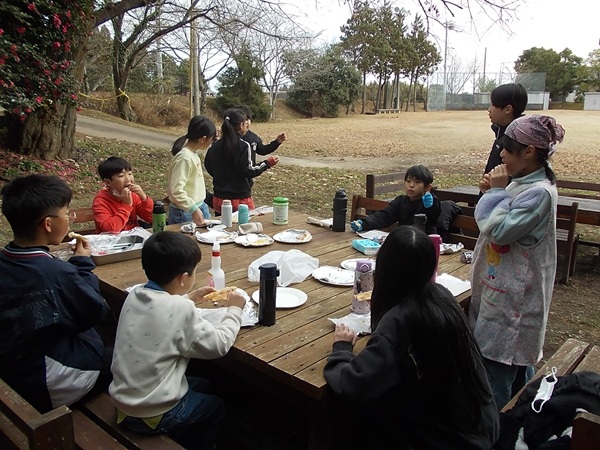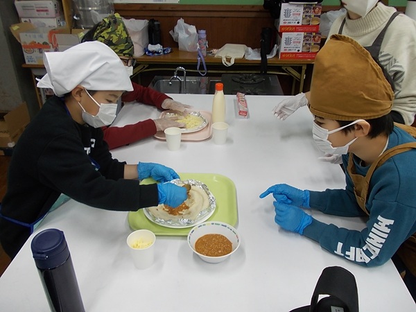 12月19日(金)1・2限目、グランドの一画にあるピザ窯でピザづくりを行いました。つくったのは、「チーズとコーンとマヨネーズのピザ」と「キーマカレーとチーズのピザ」です。なかよし班(縦割り班)ごとに家庭科室に入り、上級生と下級生がペアになってそれぞれ1枚ずつピザをつくります。ピザ台の上に、チーズとコーンを広げて乗せてマヨネーズを回しかけたり、レトルトのキーマカレーを塗ってからチーズを乗せたりとお手軽なピザづくりでしたが、上級生が下級生の面倒を見ながらわいわいと楽しそうに作業をしていました。完成したピザをグランドのピザ窯に持っていって焼いてもらうと、四分の一にカットして、2種類のピザを一切れずついただきました。今年の新作の「キーマカレーとチーズのピザ」はけっこう好評だったようです。ぜひ、お家でもつくってみてください。お世話になりました主任児童委員の鳥居さん、白川地区まちづくり協議会事務局の明石さん、ありがとうございました。