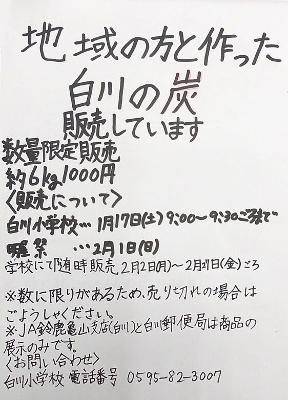 1月15日(木)昼休み、6年生が白川郵便局とJA鈴鹿亀山支店(白川)に出かけ、1月17日(土)から始まる「白川の炭」販売に向けてのポスター掲示と見本品の展示をお願いしてきました。1月17日(土)フリー参観の9:00~9:30、2月1日(日)明星祭にて販売し、在庫が残れば2月2日(月)からの平日にも随時販売する予定です。今年度は、昨年よりも炭の収量が少ないため、売り切れの際にはどうかご容赦願います。現在、子どもたちが急いで販売準備を進めています。