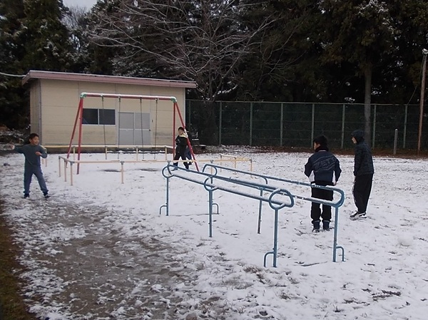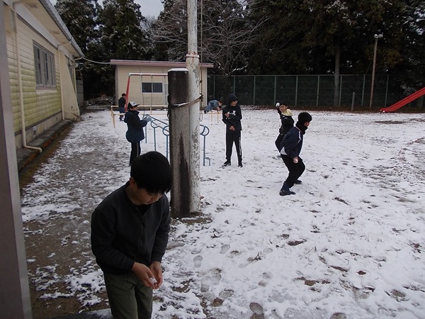 1月9日(金)朝、昨晩の雪で白川小学校もほんのりと雪景色です。子どもたちは、登校すると早速外に出て、雪遊びや雪合戦に興じていました。半袖や短パンで走り回っている子も…。風邪をひかないようにね。
