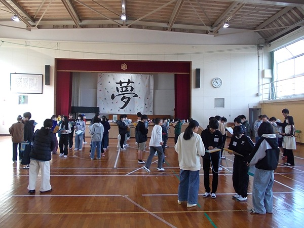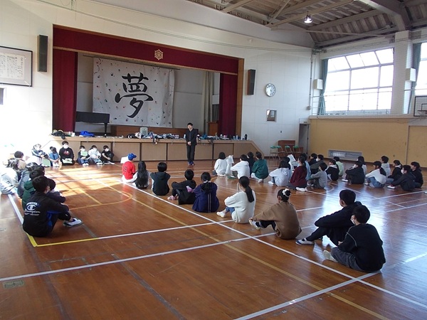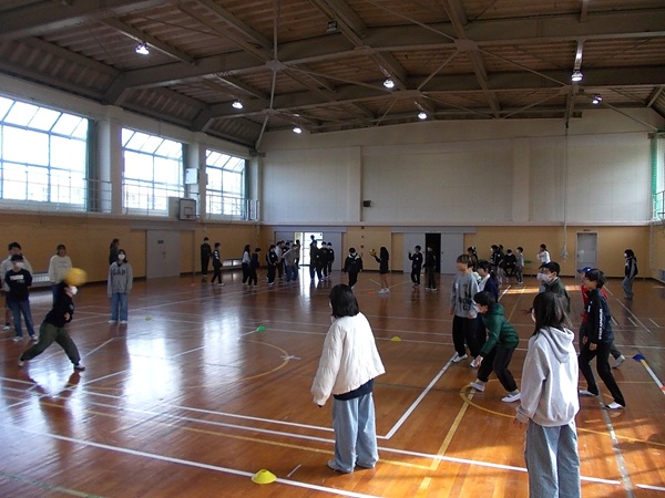 2月5日(木)2・3限目、6年生が亀山南小学校を会場に行われた亀山中学校区の「第2回 四小交流」に参加しました。「四小交流」は、亀山中学校へ進学する小学校の中で比較的人数の少ない神辺小・亀山南小・昼生小・白川小の4校の6年生児童が、自己紹介や遊びを通して仲間づくりをすすめることを目的に行われているものです。この日は本年度二回目の交流会ということもあり、子どもたちもリラックスした様子で交流に臨んでいました。前半の活動では、互いに自己紹介してから質問をして、マス目に書かれた条件に合う人をさがしていく「人間ビンゴ」を行いました。ビンゴを目指して、自分から積極的に他校の人にも話しかけている姿が見られました。後半の活動では、4つのチームに分かれて「王様ドッジボール」を行いました。チームの中で一人王様を決めて、王様が当てられたらその時点で即終了というドッジボールです。中には、まだまだ人数が残っているのに王様が当てられてしまって早々に終わってしまう試合もあり、子どもたちはハラハラドキドキしながら体を動かして楽しんでいました。