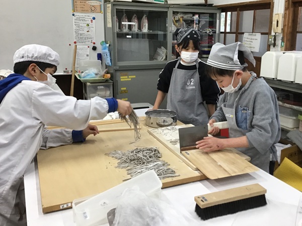 2月16日(月)午前中、加太のそば打ち名人の北澤さんを講師に迎え、3・4年生が「そば打ち体験」学習を行いました。地域の皆さまの協力のもと、夏に種をまき10月末に収穫したそばの実を乾燥させた「玄そば」を挽いてつくったそば粉を原料に使いました。そば粉4に対して小麦粉1を混ぜた「二八そば」を今回はつくりました。講師の北澤さんの指示のもと、生地をこねて伸ばし、打ち粉を振りながらたたんで、最後に包丁で切って麺の完成です。名人の打つそばとは比べ物にはなりませんが、思うように伸びない生地や重くて扱いにくい包丁に四苦八苦しながらも、子どもたちは何とか「そば」を作り上げることができました…。日ごろなかなかできない体験をさせていただくことができましたね。将来の「そば打ち名人」の誕生を楽しみにしています。