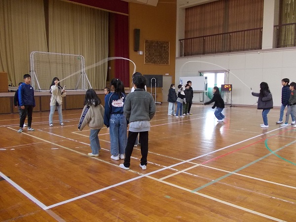 2月7日(金)業間、これまでの2週間で取り組んできた「大縄跳び」の最後の取組を行いました。なかよし班(縦割り班)でのこれまでの練習の成果を発揮する場面です。始めに軽く練習をした後、3分間の制限時間の中で班全員で8の字跳びを何回跳べるか(引っかかった場合は、今まで跳んだ数の続きから数える)に挑戦しました。中には100回以上跳べた班もあり、目標回数を大幅に上回れたと満足そうな様子でした。跳び終わったあとは班ごとに集まって振り返りを行い、「できるだけ真ん中で跳ぶことを意識して、連続して跳べるように頑張りました」「跳べる人も跳べない人もいたけど、来年は皆が跳べるようになりたい」「最初はちゃんと跳べなかったけど、最後はみんな跳べるようになった」など、頑張ったことや次への目標を発表してくれました。仲間と協力し合い目標に向けて努力した経験を、ぜひ今後に生かしていきましょう。