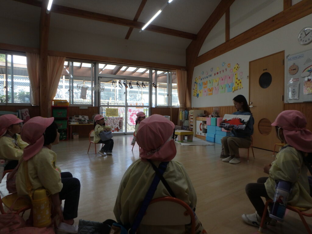 保護者の方の保育体験で、絵本を読んでもらいました。絵本をご持参いただき、今月は年少さんのクラスで素敵な絵本を3冊読んでいただきました。最初の本は、信号機の色が紫色になったら、だんごむしがゴロンゴロン…オレンジ色だったら車がオレンジジュースを飲んで…などなど。楽しい想像を膨らませながら楽しく見せてもらっていました。2冊目はパンダが可愛い体操をするのをみんなで真似してみて同じポーズに挑戦したり…最後の本は、恐竜のたまごはどんな恐竜のたまごかな?と数々の恐竜のお母さんが出てきて、それぞれの恐竜の特徴に気付ける楽しい内容のものでした。タイプの異なる絵本に年少さんはどれも楽しそうに見ていました。