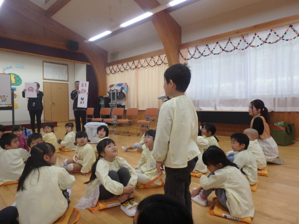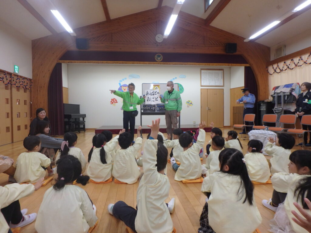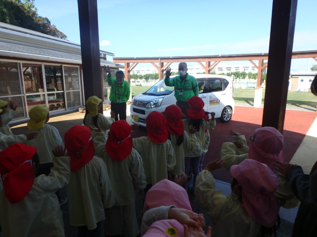 園に不審者が侵入してきた時を想定した防犯訓練を行いました。園内の合言葉で園児たちは素早く動き、上手に避難できました。「いかのおすし」の標語も覚え、その一つ一つの意味をしっかりと理解して防犯に対する意識を幼児たちもつけていけるといいなと思います。警察の方や教育委員会の方、青パトさんの方々からお話を聞き、また青パトさんの車も見せてもらい、この地域の大人が子どもたちみんなのことを守ってくれていることも知りました。