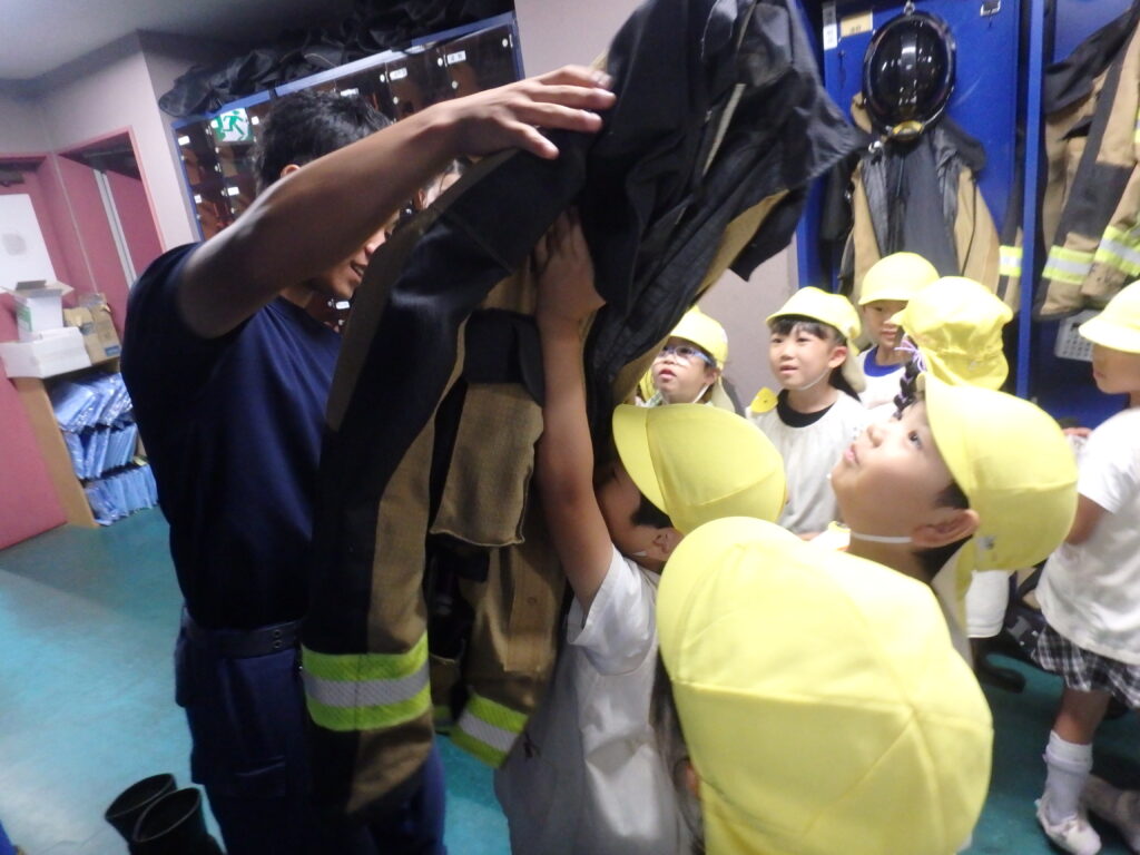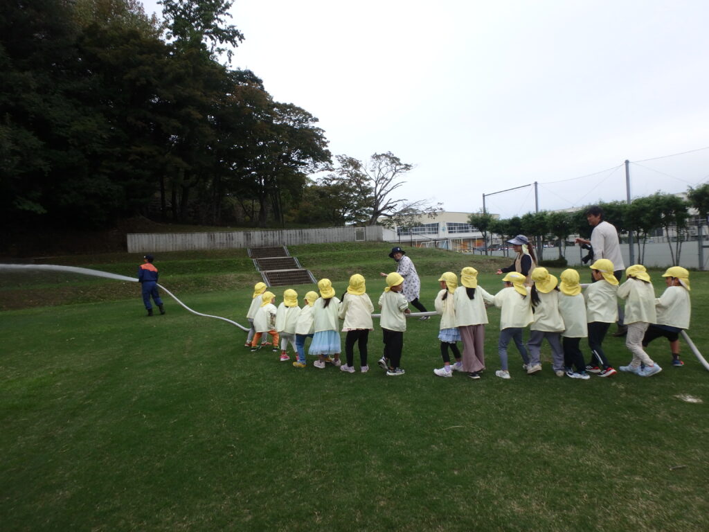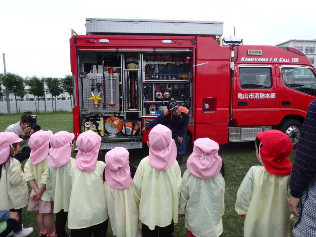 幼稚園に大きな消防自動車が来ました。消防士さんに避難訓練をする様子も見てもらい、防火についての話も聞きました。写真を撮ってもらったり、消防車の装備品等の説明を聞いたりしたあと、消防車に乗せてもらいました。「わぁーすごい!」「かっこいいな」と言い、みんな喜んでいました。それから、年長さんの放水体験!年長さんみんなで長いホースをしっかりと持って、放水するところを年中さん、年少さんは「わぁ~」と言って眺めていました。水圧でホースが固くなる感触も感じ、「堅かった」「重かった」と言う年長さん。消防士さんに憧れの気持ちをもつ子もいるようです。