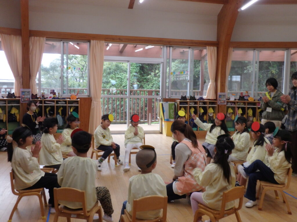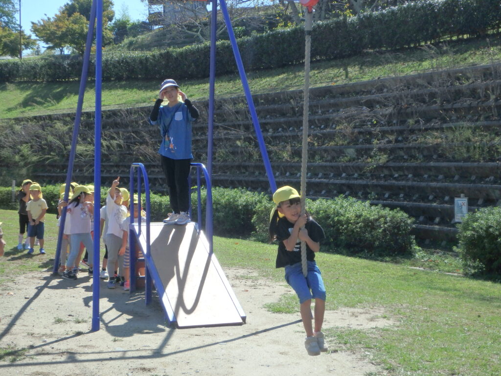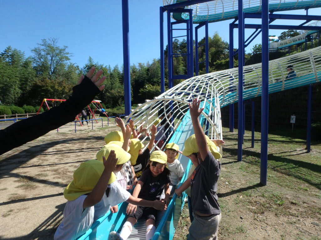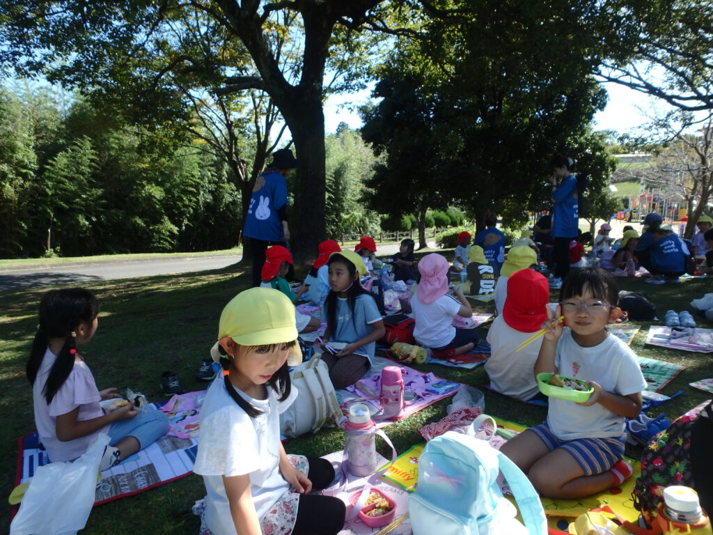 秋晴れのなか、亀山公園へ遠足に行きました。道を渡る時は、車やバイクなどが来ないかしっかりと見て、聞いて、安全に歩いて行くことができました。道々、商店街を通ると、帽子屋さんやおもちゃ屋さん、本屋さん、ご飯屋さん、病院もあり、出会った人には「こんにちは」と上手にあいさつもして行きました。長い距離でも頑張って歩いて行き、亀山公園へ到着し、ももぐみさんと合流しました。写真を撮ってもらい、約束事を聞いてからみんなで大きな遊具で遊び、どの子もとても楽しそうでした。たくさん遊んだ後は、手をきれいにしてお弁当タイム。青空の下でいただくお弁当はいつもより増して美味しそうに食べていました。おやつも友達と見せ合って嬉しそうに食べていました。どんぐりなどの木の実も拾い、たくさんの自然のなか、めいいっぱい遊び、楽しい遠足でした。