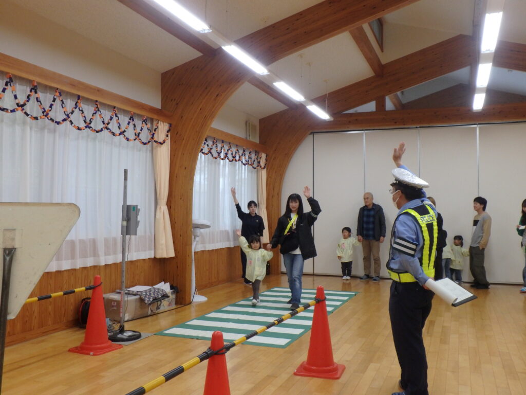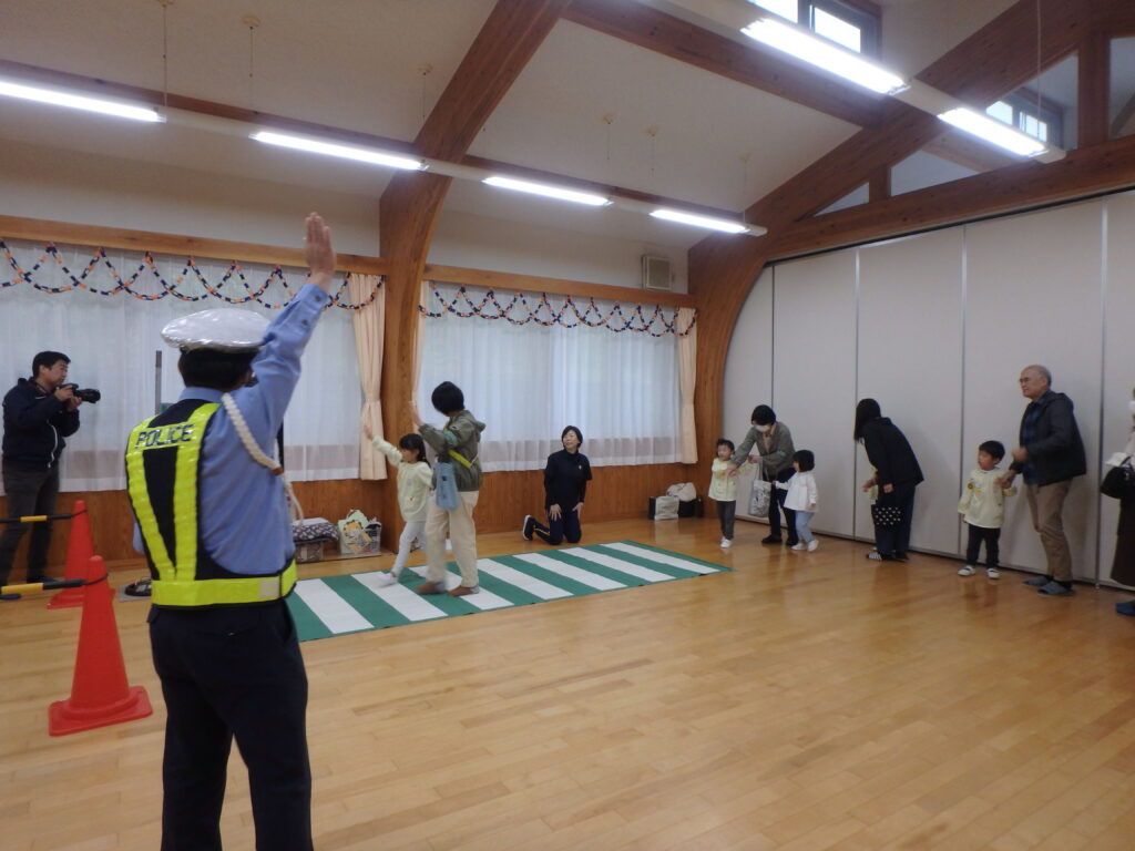 二学期の親子カモシカ集合訓練では親子で指導員による指導のもと、模擬横断歩道を上手に渡り、お家の人と一緒に練習しました。また、PTA役員・委員さんのカモシカ指導員による紙芝居や信号バスケットなどでも楽しく交通安全について確認しました。亀山警察署からおまわりさんがパトカーに乗って来てくれたので見せてもらったり、「ウー!」の音を聞かせてもらったりしました。帰りの降園指導では本日教わったことを実際の道路や横断歩道でおまわりさんの見守るなか、実践し敬礼のポーズもカッコよく真似していました。