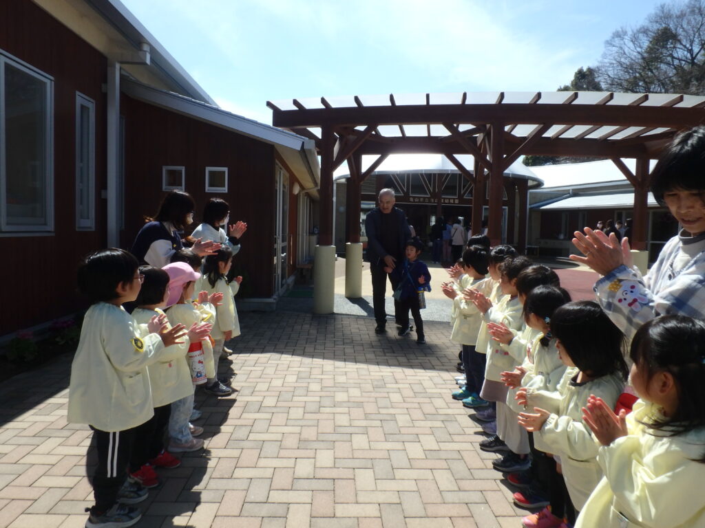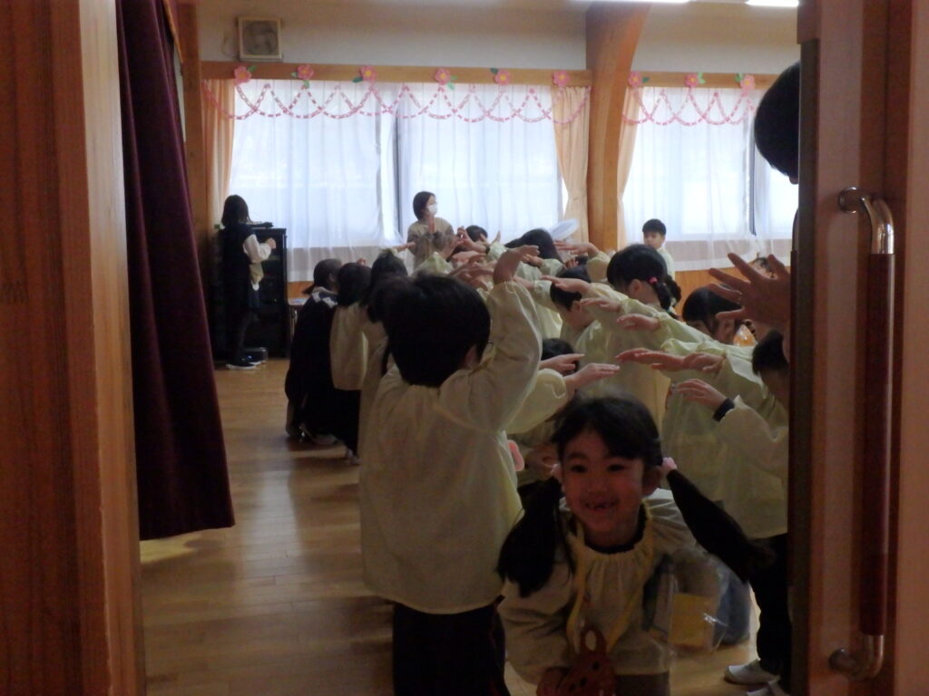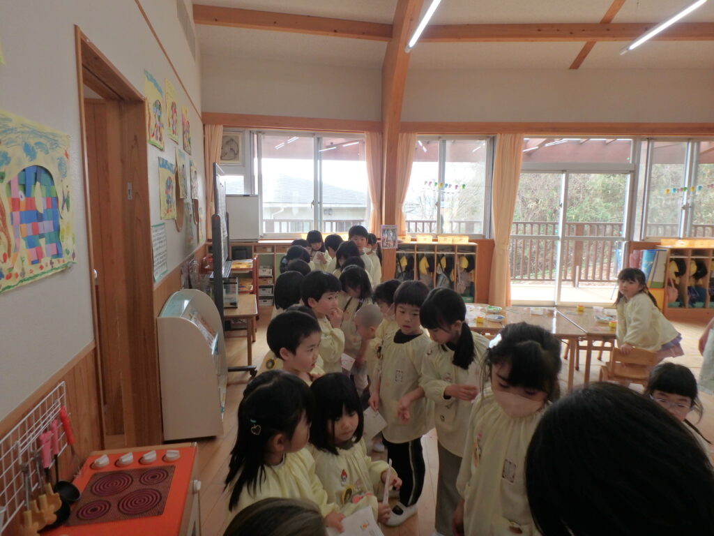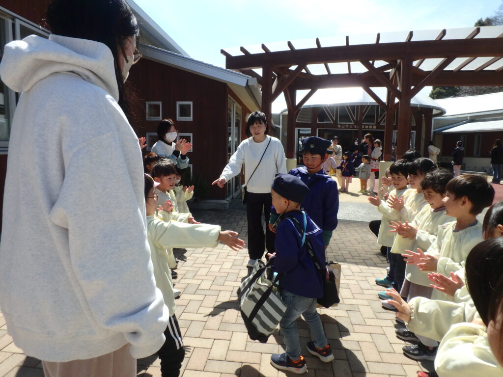 明日で幼稚園を巣立っていく年長組のお兄さん・お姉さんを年中さん、年少さんが見送りました。「たくさん遊んでくれてありがとう」「優しく教えてくれてありがとう」「元気でいてね」などと声をかけながら、さよならしました。