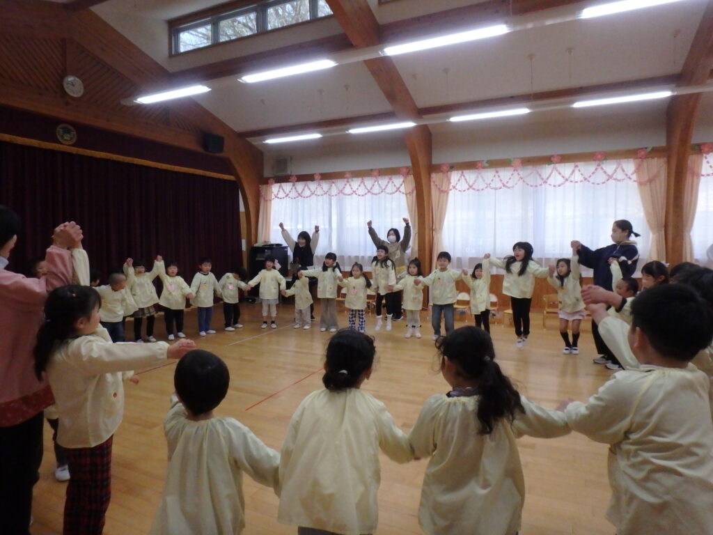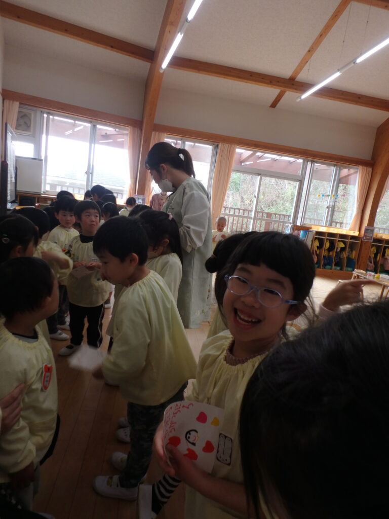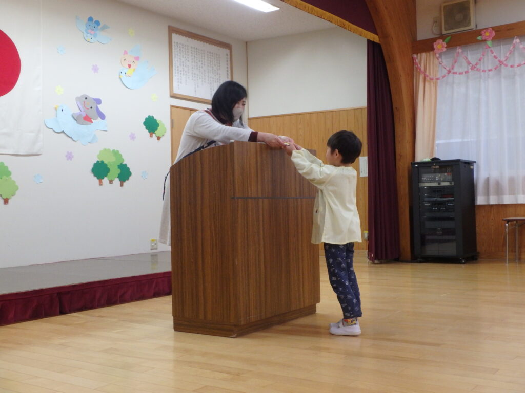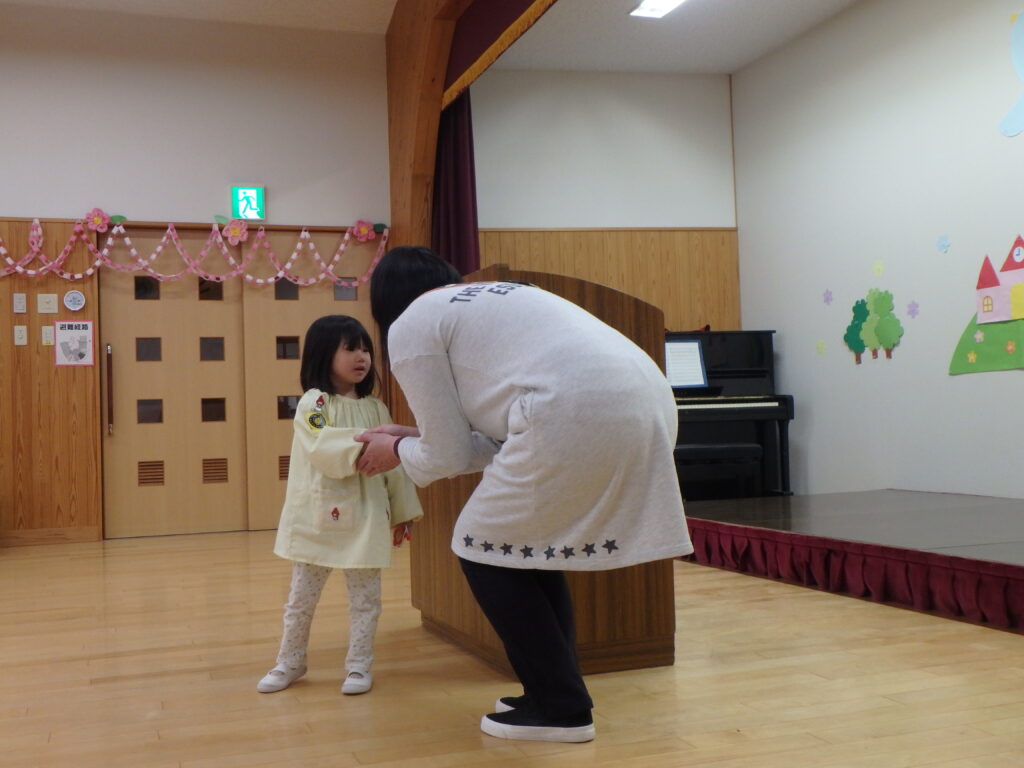 明日で幼稚園を巣立っていく年長組のお兄さん・お姉さんを年中さん、年少さんが見送りました。「たくさん遊んでくれてありがとう」「優しく教えてくれてありがとう」「元気でいてね」などと声をかけながら、さよならしました。