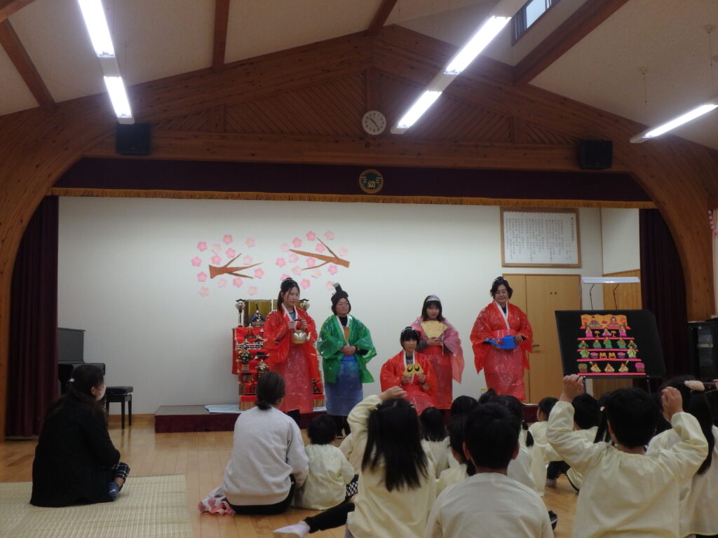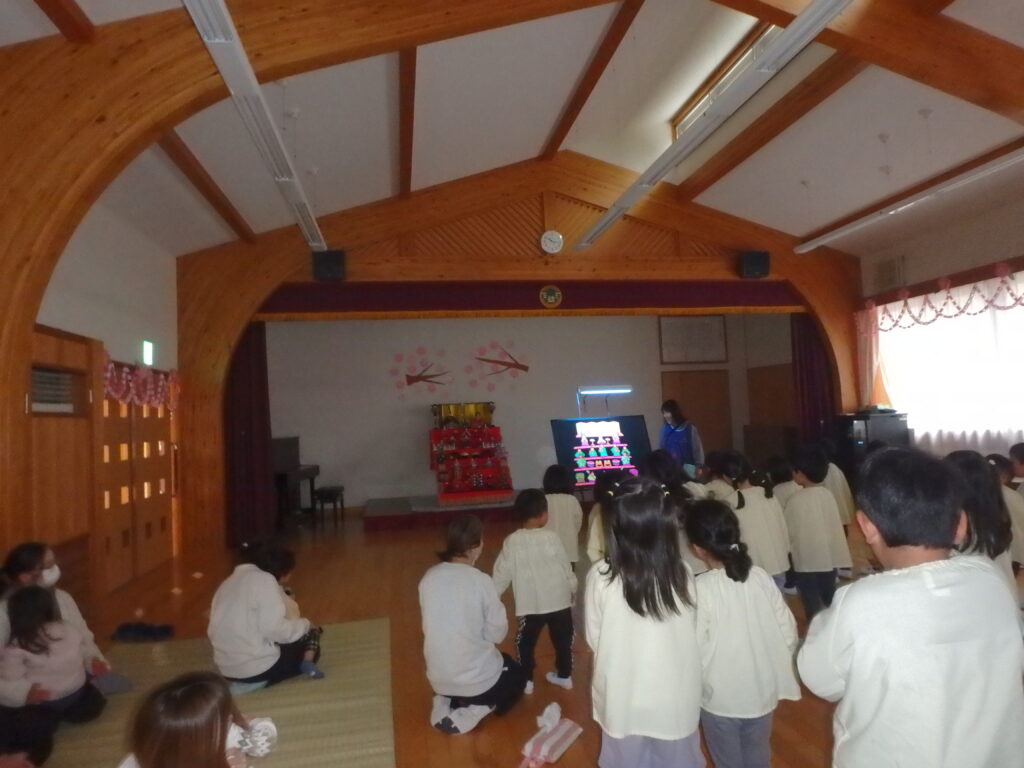 幼稚園の段飾りのおひなさまが飾られているところで、みんなでひなまつり会をしました。ふれあいデーに来てくれた未就園児さんと一緒に歌を歌ったり、パネルシアターを見たり、間違え探しをしたりして楽しみました。