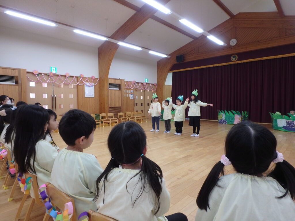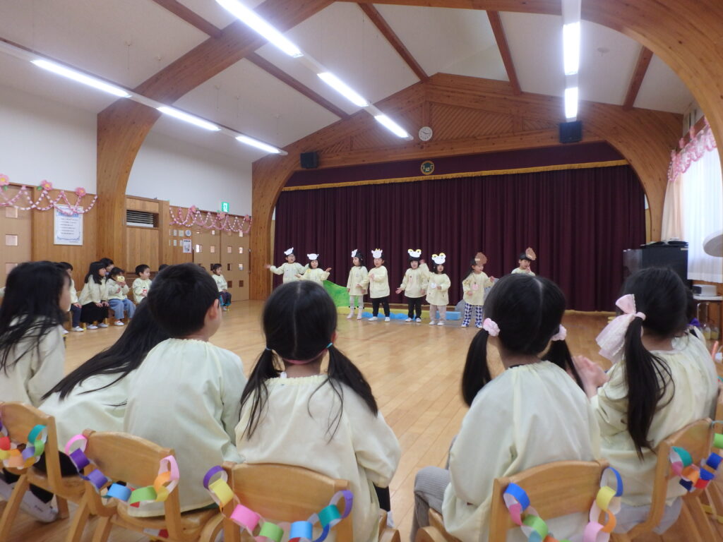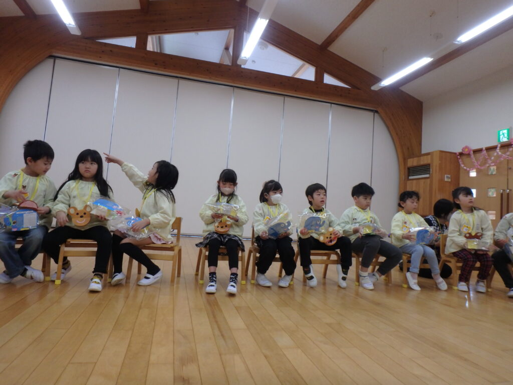 これまで一緒に遊んでもらったり、いろいろなことを教えてくれたりした優しいひまわり組のおにいさん、おねえさんに楽しんでもらおうと、年中さんが中心となってお別れ会を行いました。年少さんや年中さんの劇を見てもらったり、「ありがとうの花」の歌を歌ったり、感謝のことばを言ったりしました。手づくりのプレゼントも送り、年長さんも喜んでくれました。