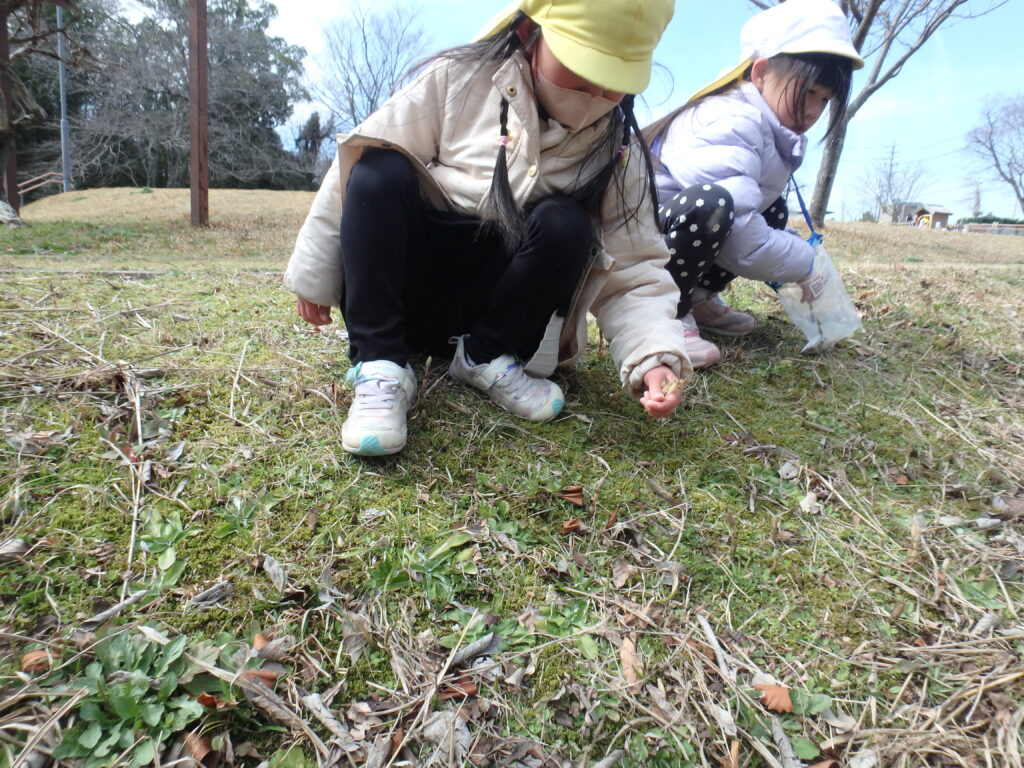 年中さんが年少さんをリードして手をつなぎ、一緒にひだまり公園へお散歩に行きました。現地ではツクシやタンポポを摘んだり、小さな虫を見つけたりして春を見つけて楽しみました。