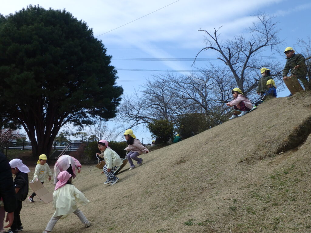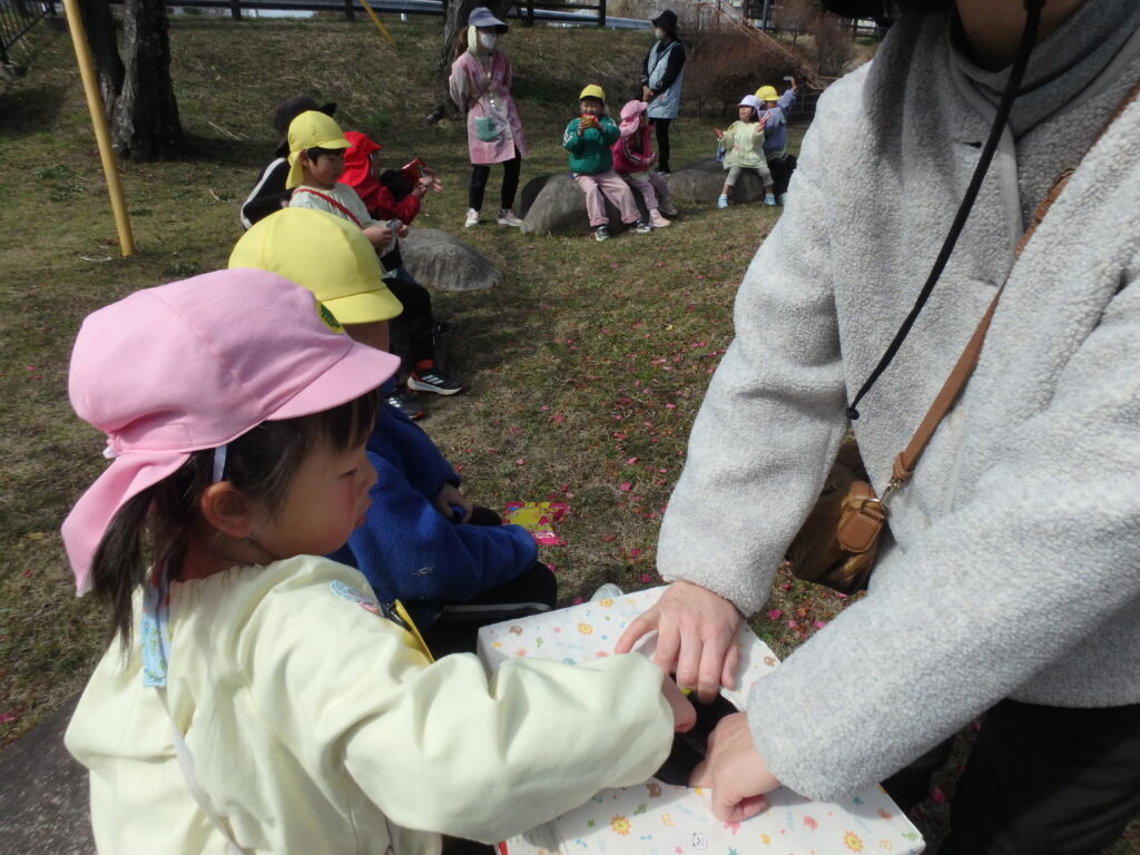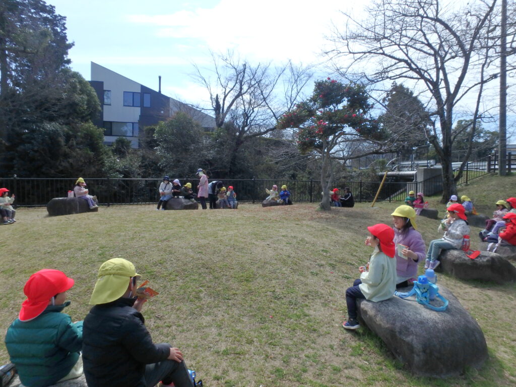 年長さんとの思い出づくりに、みんなでひだまり公園へお別れ散歩に出かけました。年長さんと行く最後の散歩は公園の広場で思いきり遊び、おやつも食べて楽しい思い出となりました。
