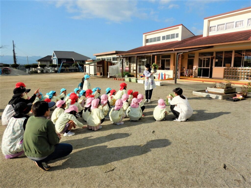 11月7日、年長児が加太保育園の年中・年長児との交流会を楽しみました。かぶとの森テラスを散策し、森の自然をたくさん感じることができました。また、加太保育園では、一緒に昼食を食べたり、園庭で遊んだりして、仲良しの輪が広がっていました。