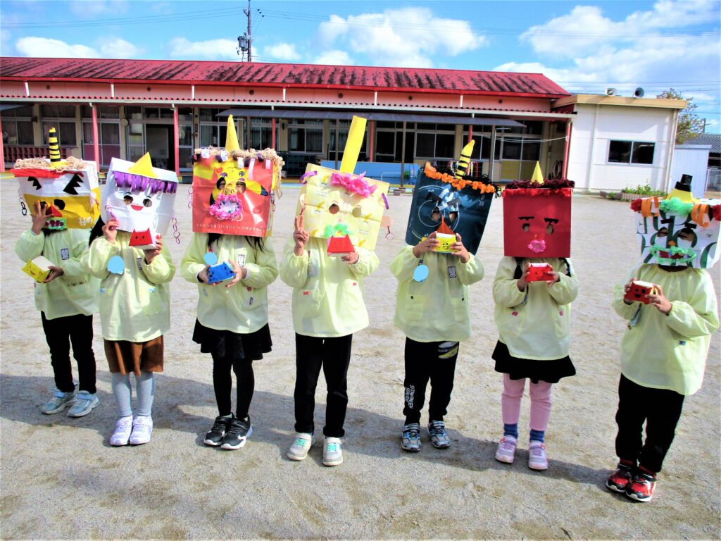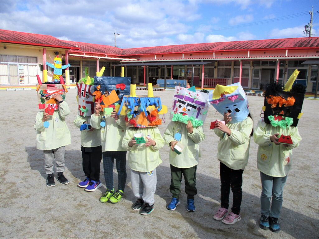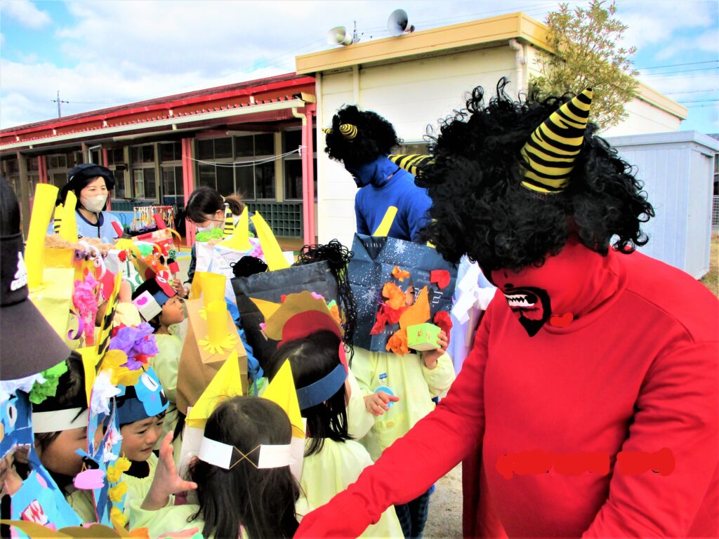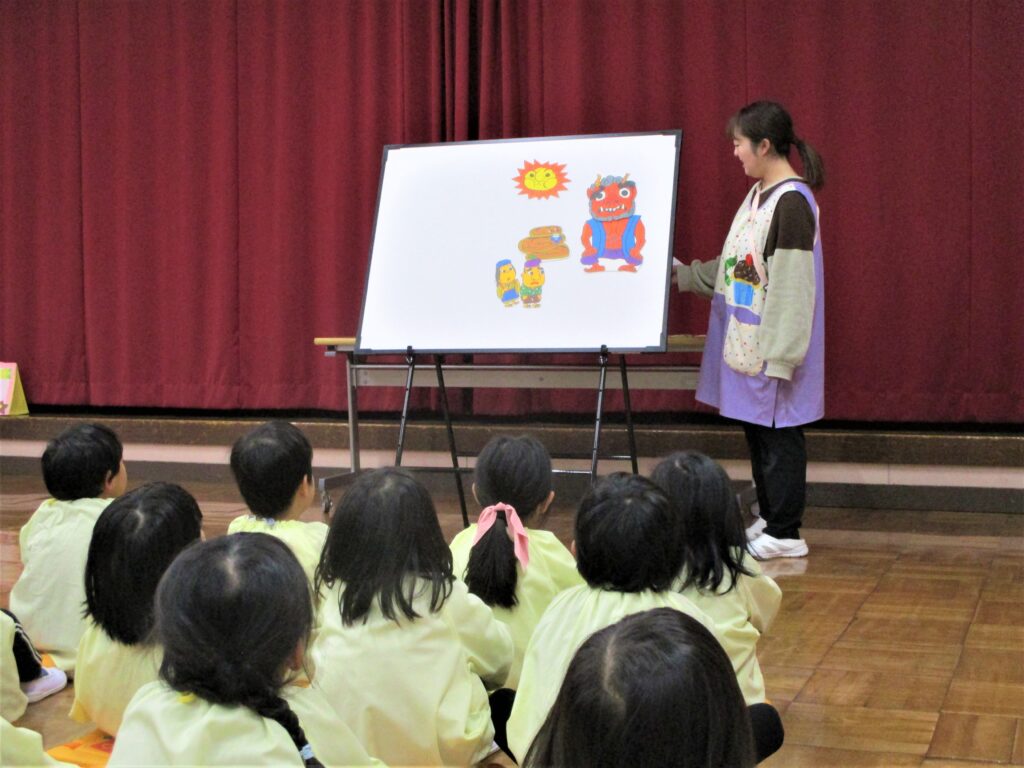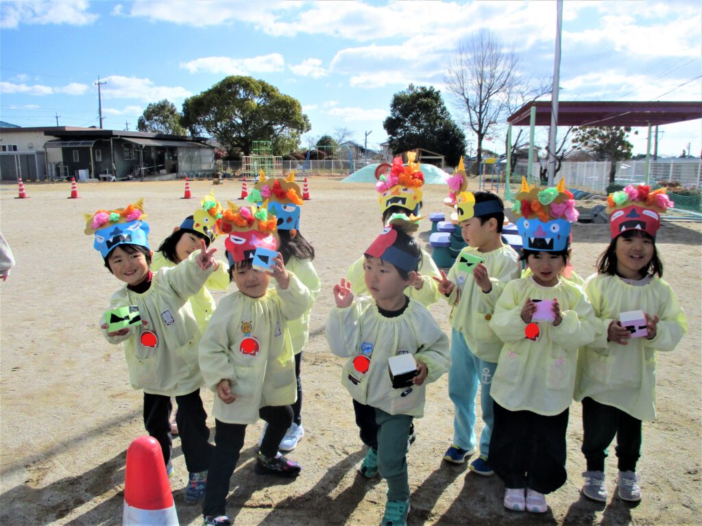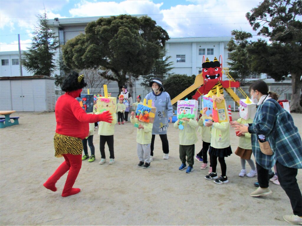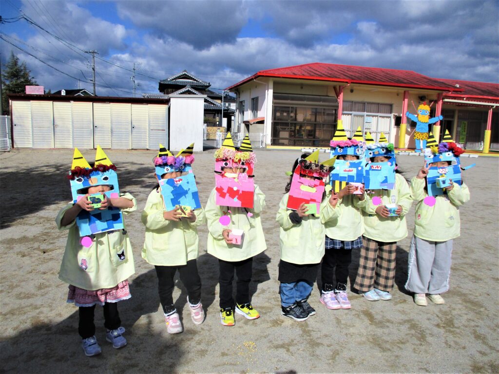 節分にちなみ、豆を炒った香りを嗅いだり、玄関や保育室入り口にヒイラギやイワシを飾ったりして、節分を楽しみました。節分のパネルシアターを見た後、「おにはそと!」「ふくはうち!」と元気いっぱいに豆まきをしていると・・・大きな太鼓の音とともに、突然、赤鬼と青鬼が現れました。驚いて後ずさりする子、勇敢に向かっていく子など、さまざまな姿が見られました。その後は、美しい音色に合わせて福の神が現れ、子どもたちはとても嬉しそうでした。