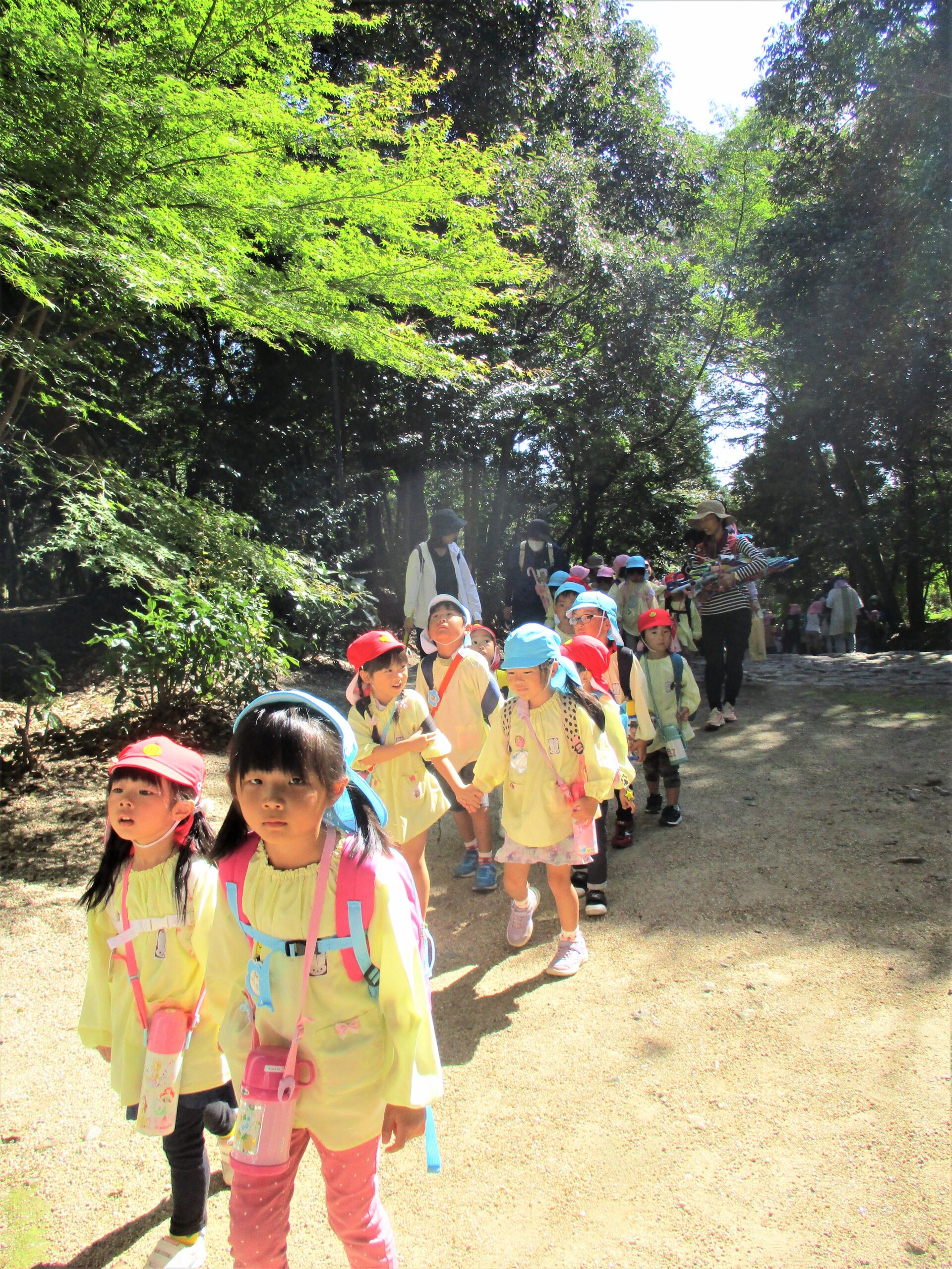 遠足は楽しかったね! 投稿日時: 2023年10月13日 投稿者: yidagawa 晴天に恵まれ、ワクワクした気持ちで能褒野神社まで遠足に行きました。保育体験の保護者の方に協力をいただき、道中の交通安全に気をつけながら、現地に向かいました。現地では、みずほ台幼稚園の友達と交流しながら、お弁当やおやつも楽しみました。また、神社内では、ドングリやさまざま木の実、木の葉等、秋の自然をたくさん発見することができました。