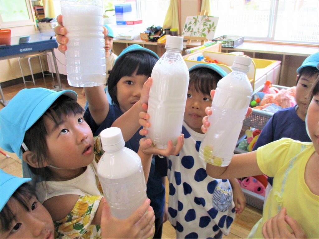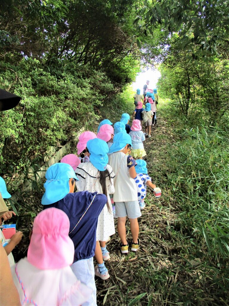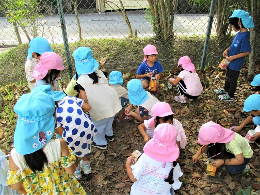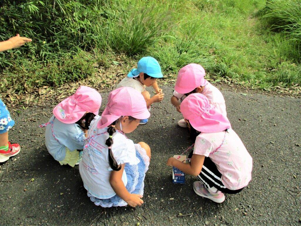 10日、幼稚園周辺へ園外散歩に行きました。道中では、ドングリやオナモミ、キンモクセイ、ムクロジなど、秋の訪れを感じられる身近な自然を発見することができました。子どもたちは、夢中になって秋さがしをしていました。園に帰ってからは、ムクロジの実で泡づくりを楽しむ姿が見られました。