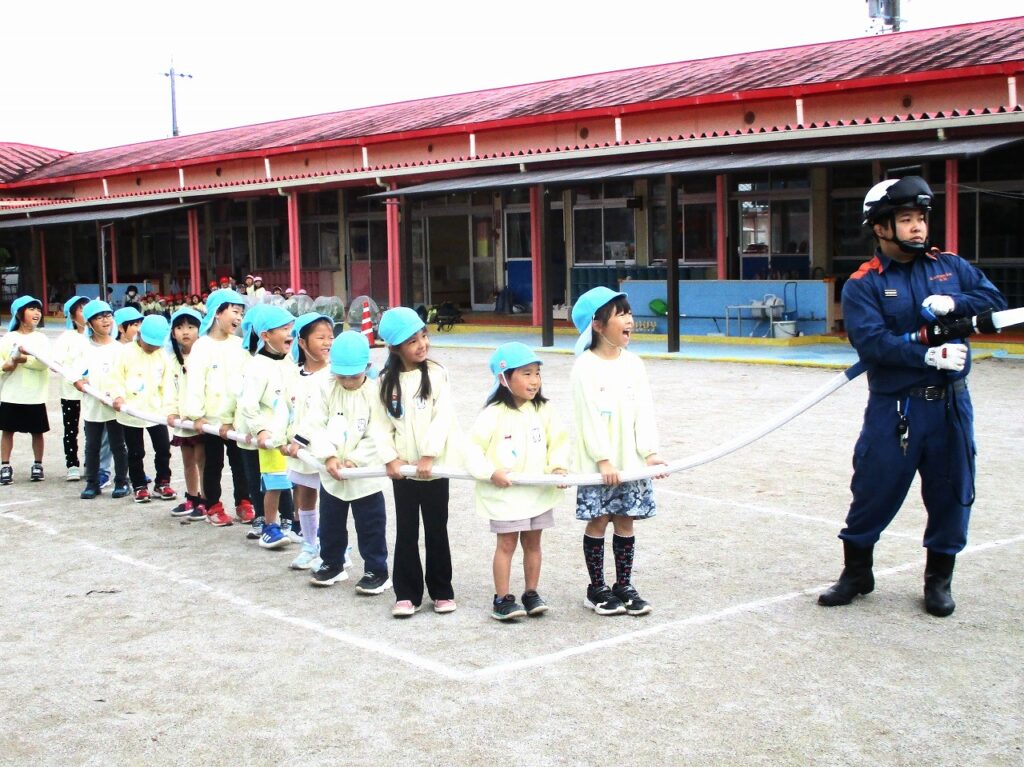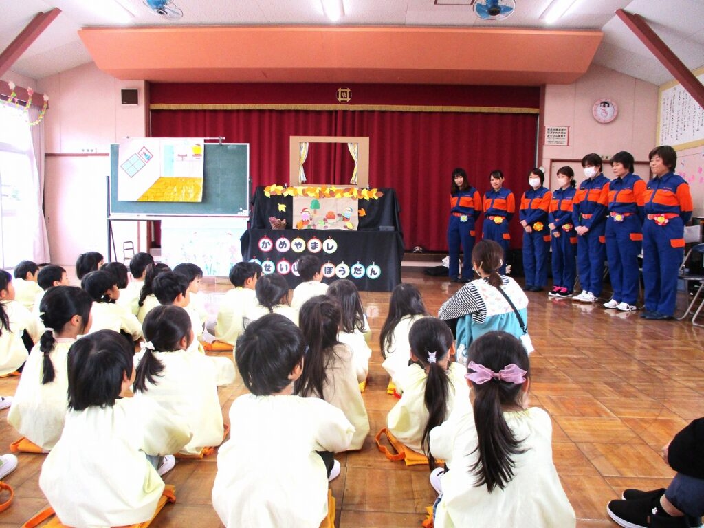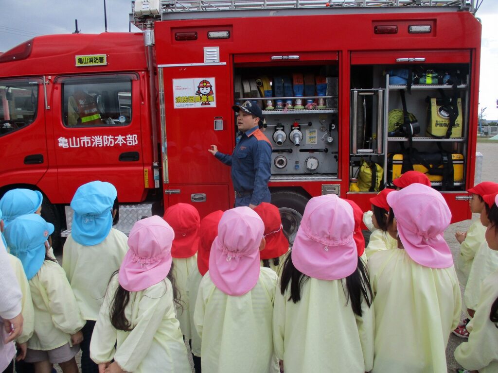 消防署要請の避難訓練(28日)を実施しました。子どもたちは、『お・は・し・も』の約束を守りながら、園庭に避難することができました。また、亀山市女性消防団の方のペープサートを通して、防災についてわかりやすく話を聞くことができました。その後は、消防自動車のしくみについて、消防士さんからの話を聞きました。