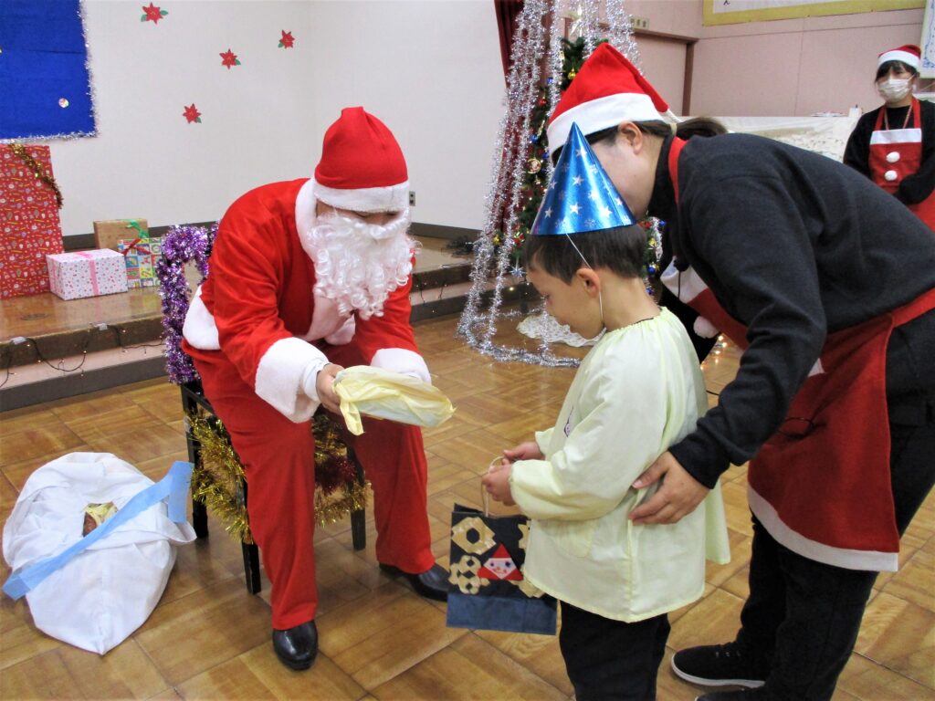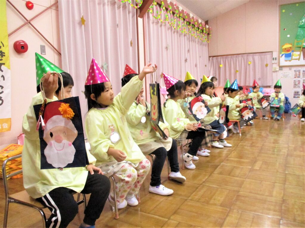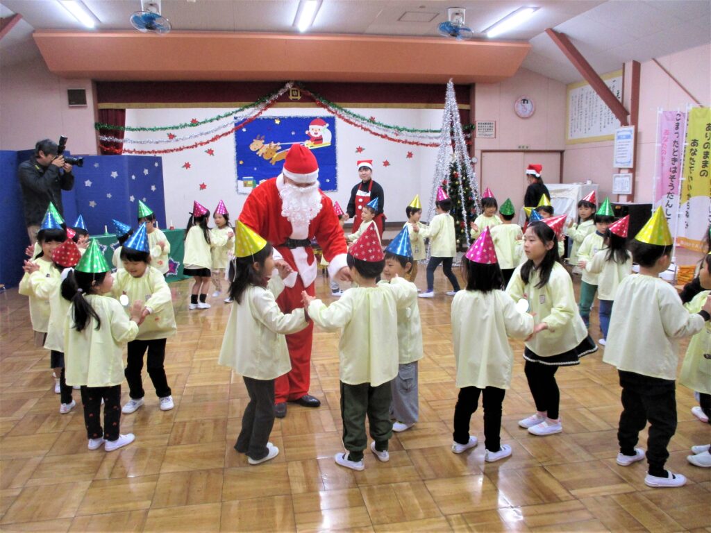 19日に大きなプレゼントを肩にさげ、「メリークリスマス!」と笑顔で手を振りながら井田川幼稚園にサンタさんが来てくれました。サンタさんは、とても優しいお兄さんサンタさんでした。皆で『シングルベル』の曲に合わせて、一緒に楽しくダンスを踊りました。サンタさんから、一人ずつプレゼントをもらったり、記念写真を撮ったりして、大満足な子どもたちでした。