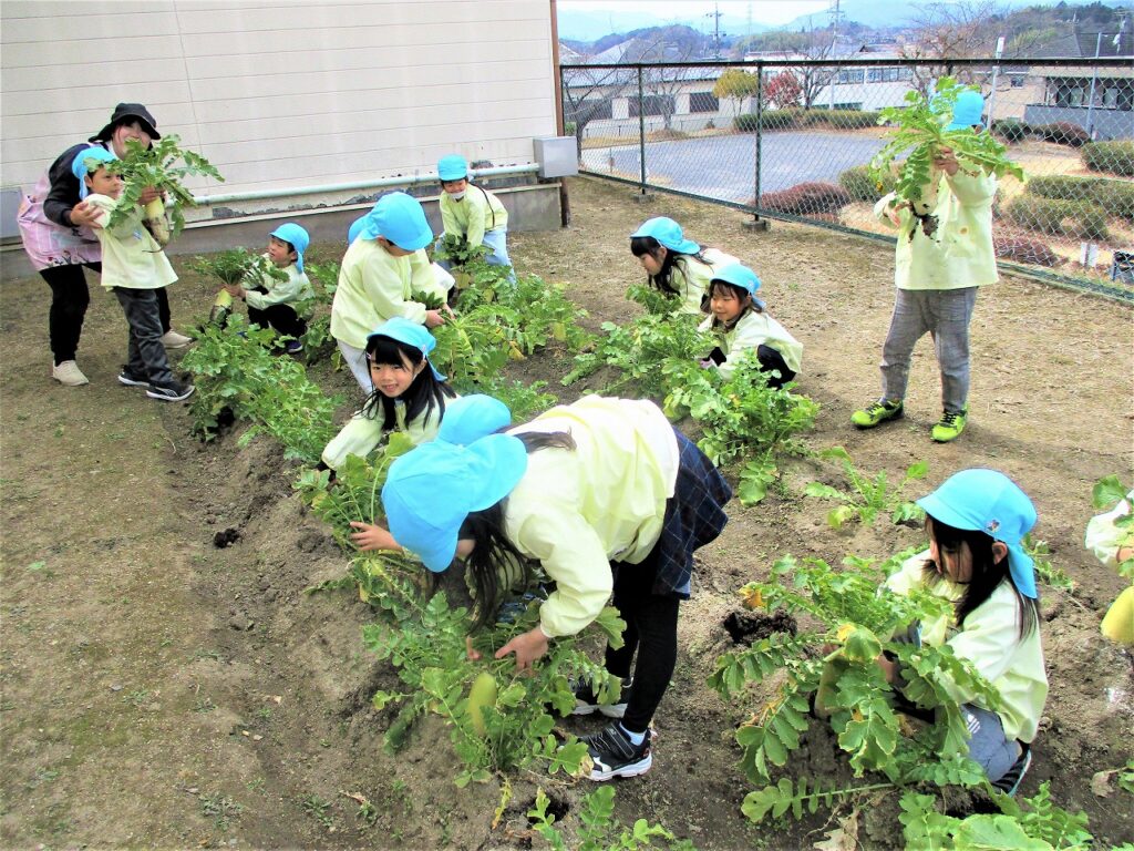 年長児が、みずほ台幼稚園の畑で大根の収穫を楽しみました。久しぶりに会うみずほ台幼稚園の友達との会話もはずみ、とても嬉しそうな様子が見られました。「やったぁ!」「ぬけたよ!」などと、大きな大根に満足気な子どもたちでした。