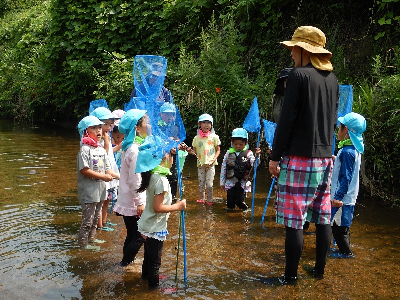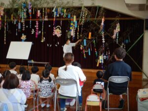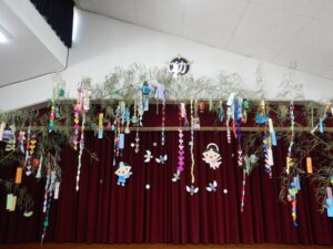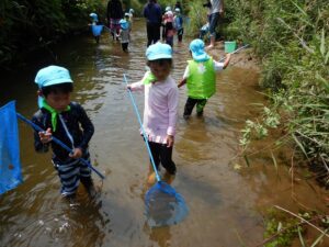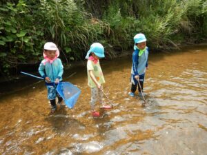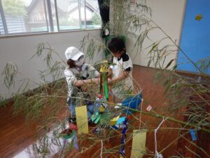 <7月> 投稿日時: 2025年10月22日 投稿者: ykameyama 年中さくら組と年長すみれ組が、川へ行きました。魚網ですくったり、手作りの釣り竿を使って魚とりに挑戦しました。 七夕飾りを作って、お家の人と一緒に笹に飾り付けました。大きな笹竹に飾りがいっぱいでとてもきれいでした。七夕の日には、ふれあいデーに来てくれた小さいお友達も一緒にお話を聞いたり、歌を歌ったり、パネルシアターを見たりして楽しみました。