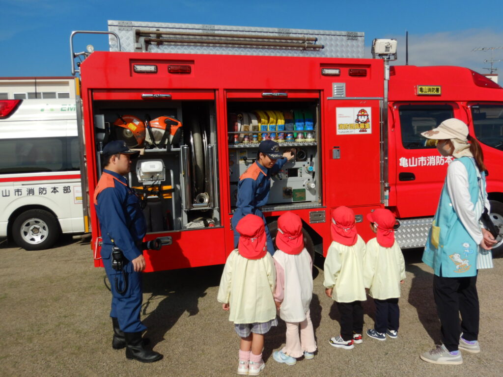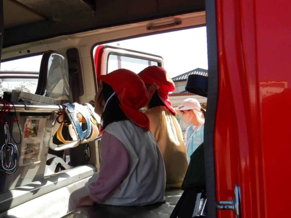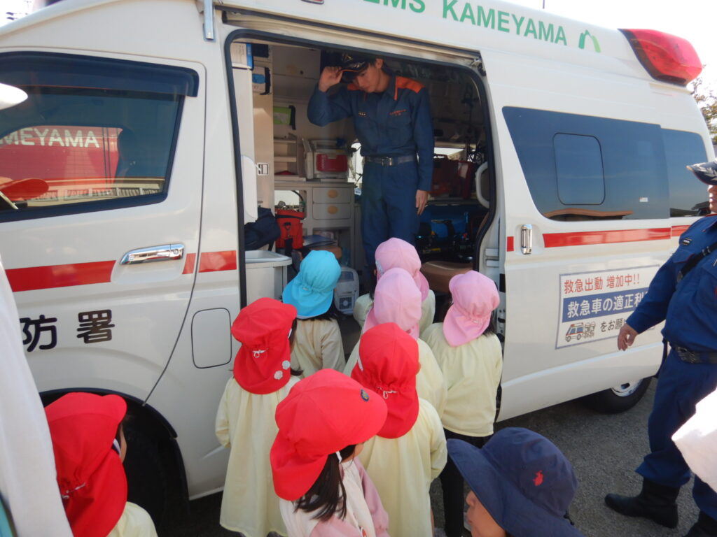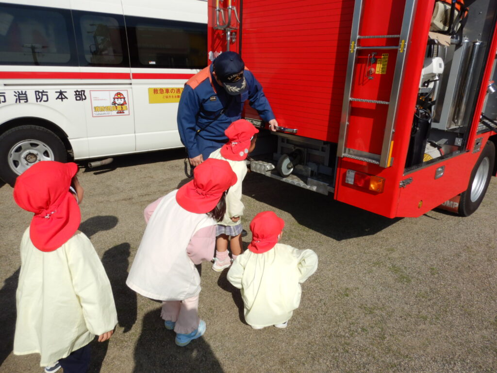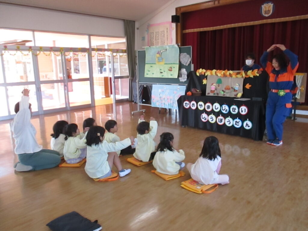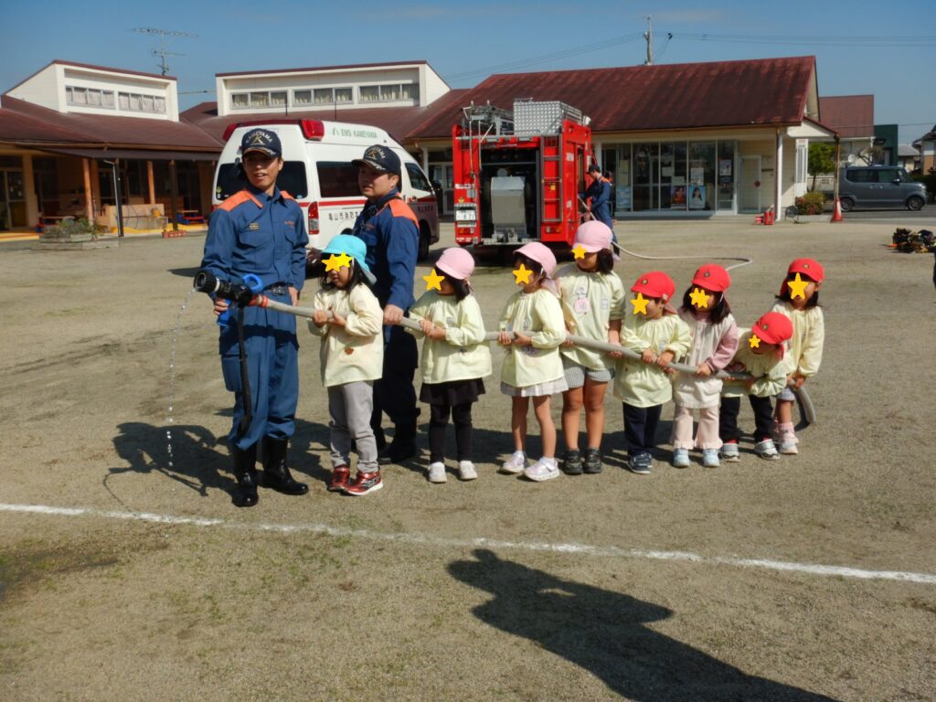 職員室の湯沸かし室から火が出たという設定で、避難訓練を行いました。先生の話をきき、煙を吸わないように口にハンカチを当て、体を低くしながら素早く避難できました。落ち着いた避難の様子を消防士さんからも、ほめていただきました。女性消防団の方々のぺープサートや、消防車や救急車を実際に見せてもらい、消防士さんからのお話を聞きました。子どもたちから「これは何に使うの?」「どうやって動くの?」などと質問が飛び、その度に優しく丁寧に答えていただき、ありがとうございました。本物の消火用ホースを持たせてもらって放水体験もでき、貴重な一日となりました。