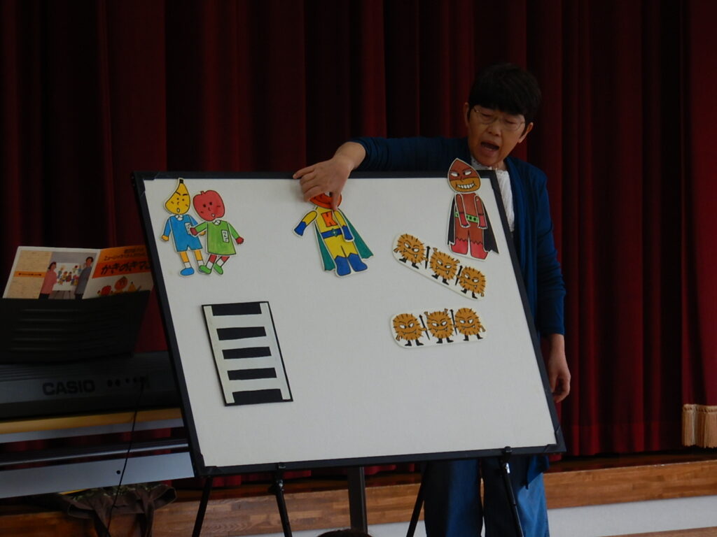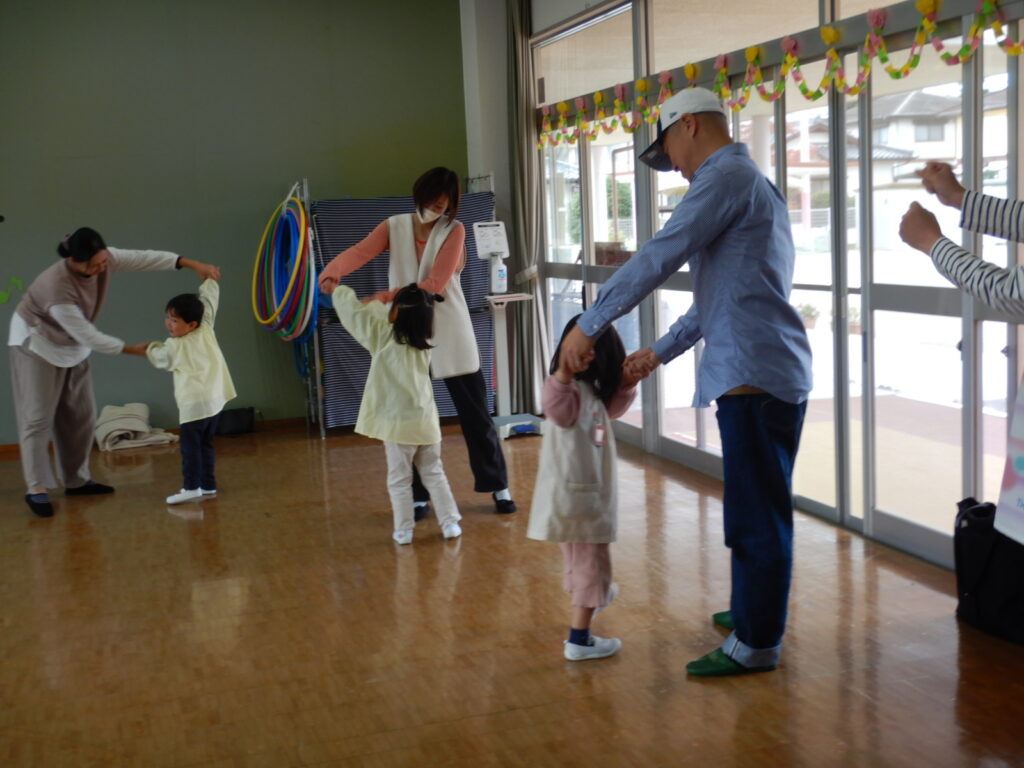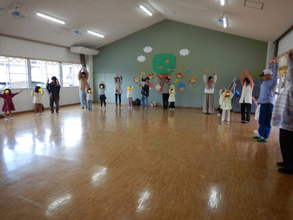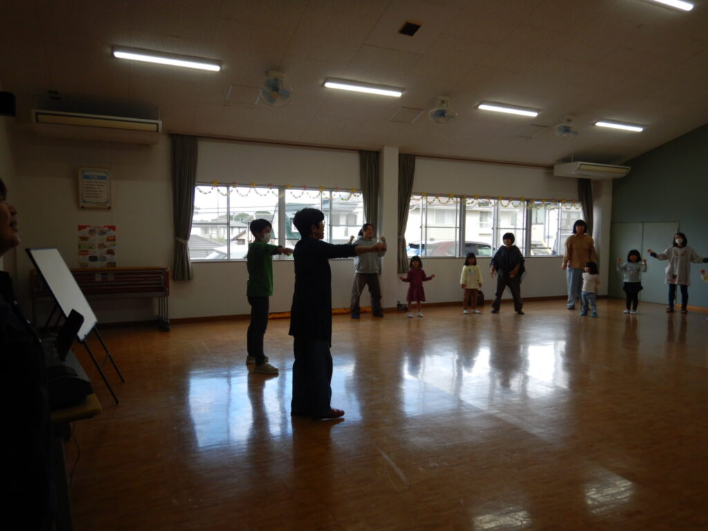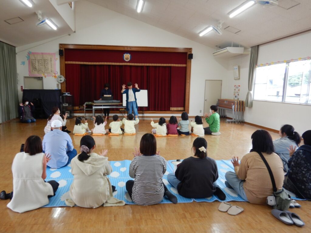にこにこミュージックボックスさんをお迎えして、パネルシアターやふれあい遊びを楽しみながら、交通安全について学びました。道路を渡るときに注意することや、手をしっかりあげて、車が来ないか確認してから横断歩道を渡ることなど、交通安全について改めて親子で考える良い機会となりました。