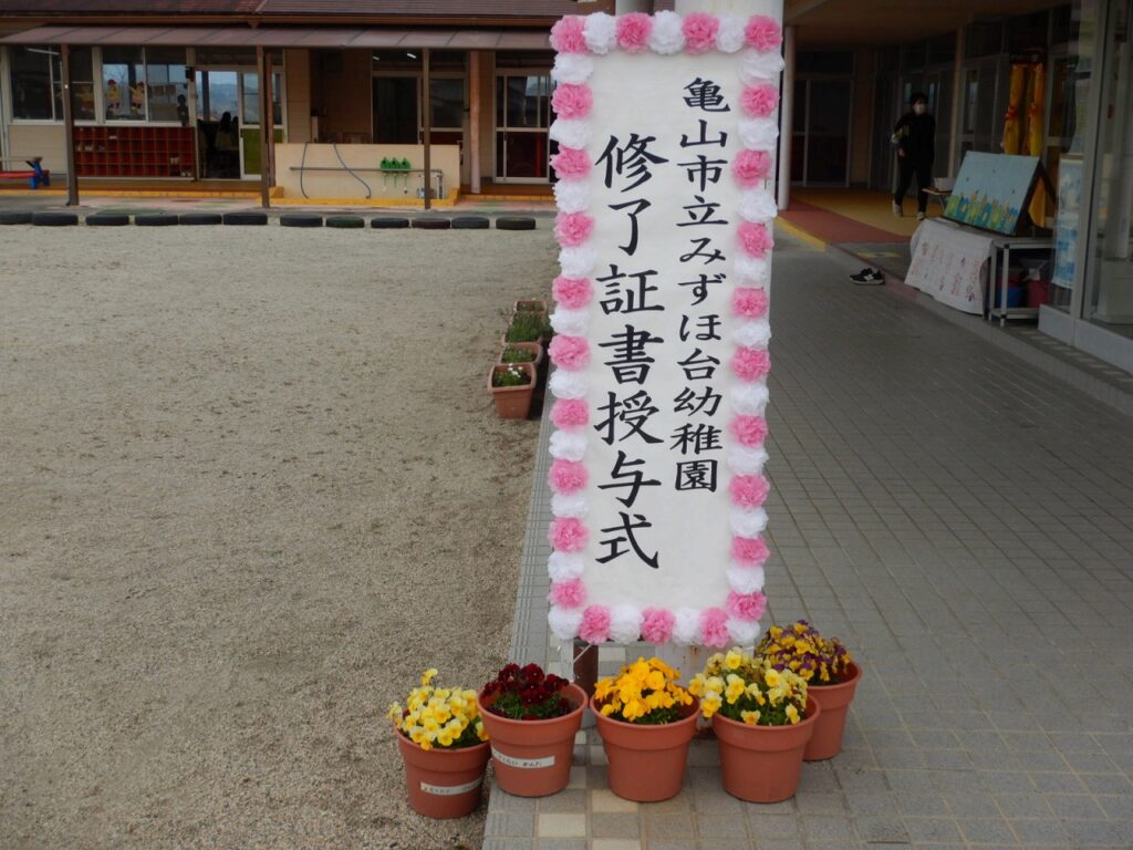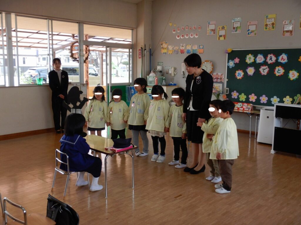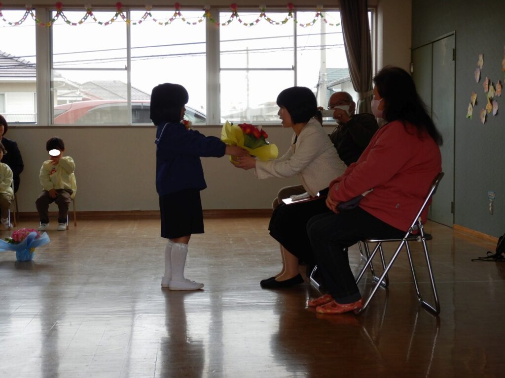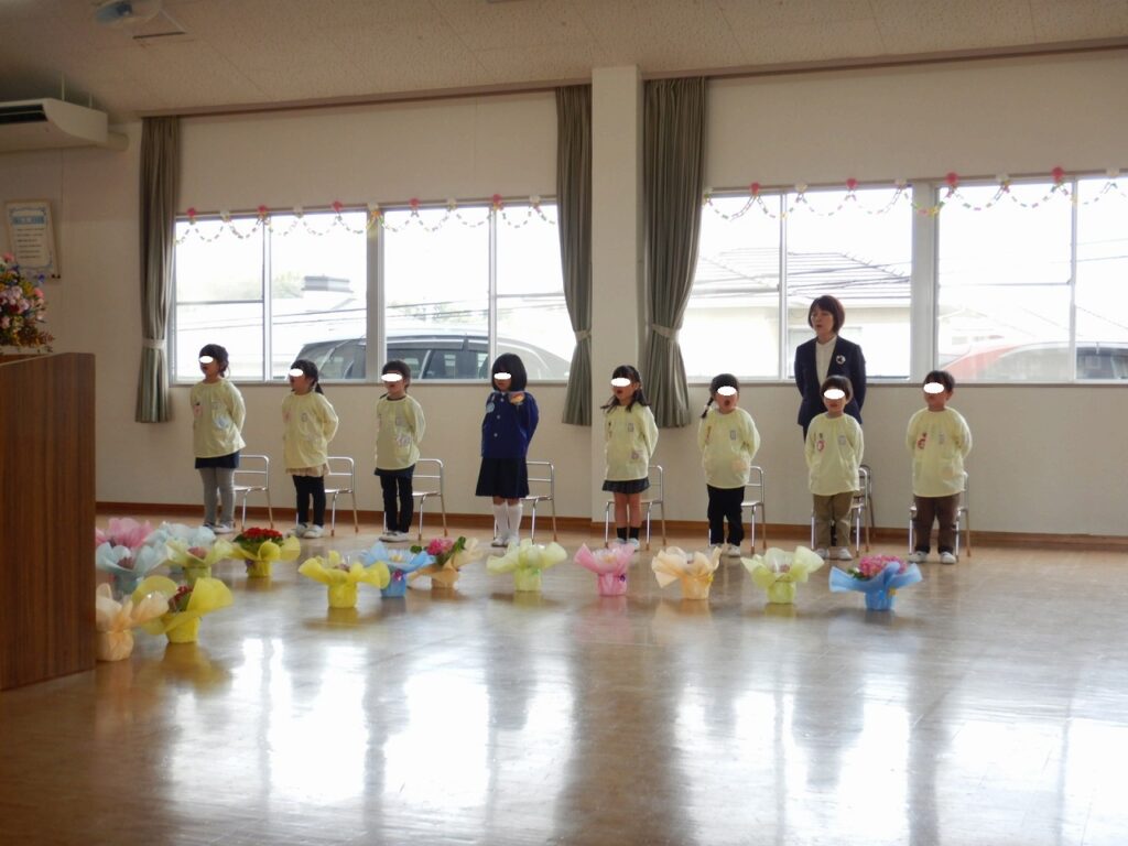 いよいよ年長さんが幼稚園を巣立っていく日となりました。華やかに飾られた会場の中、少し緊張の面持ちで入場してきた年長さん。年少・年中児も式に参加し、年長児を盛り上げて、歌を歌ったり、思い出の言葉や挨拶の言葉を元気な声で言ったりしました。その中でも、さすがの年長さん、落ち着いた姿で挨拶をし、修了証書を園長先生から渡してもらい、立派に式を終えました。きっと4月には胸を張って、小学校に入学していけることでしょう。楽しみですね!みんなが応援していますよ!